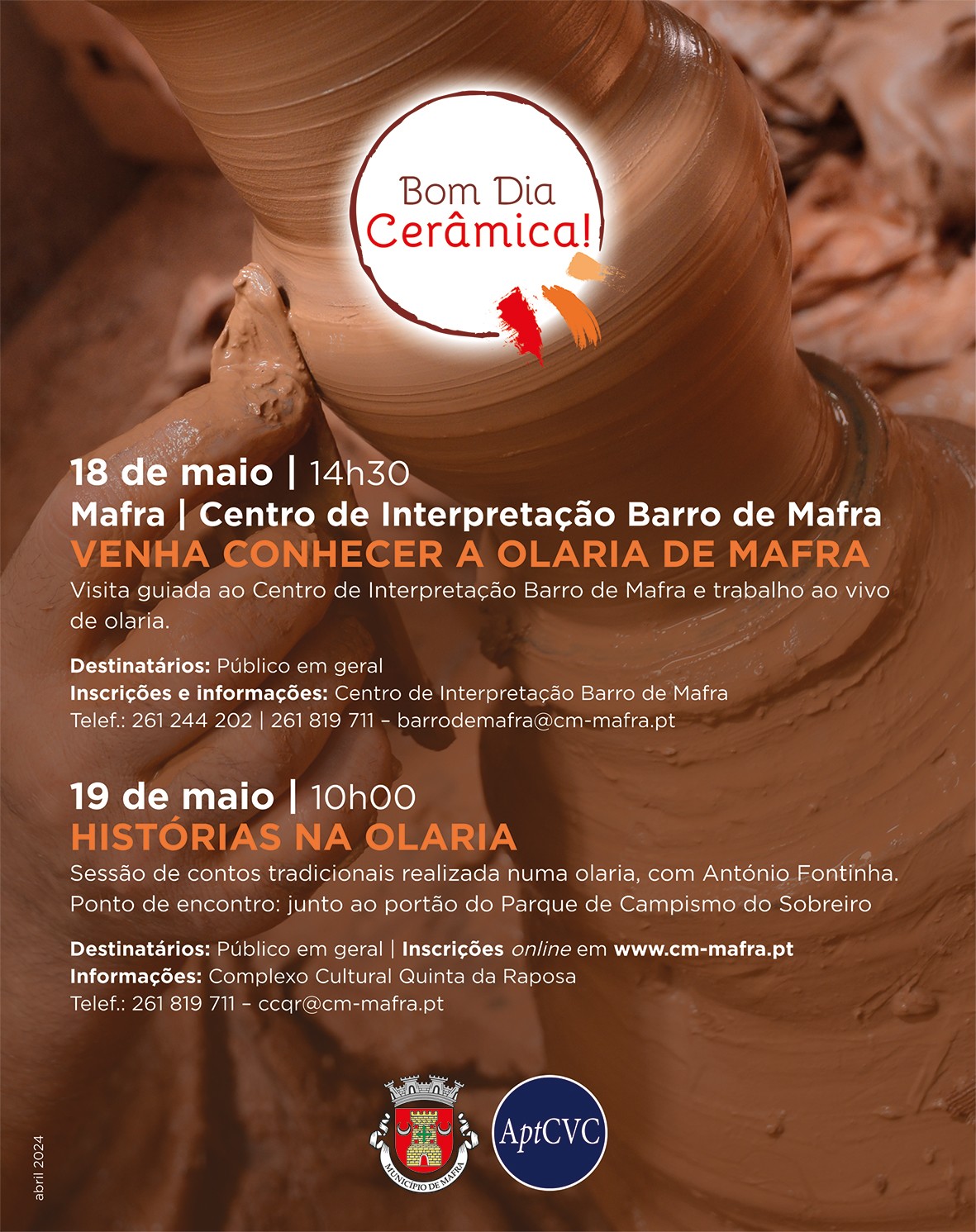 No sábado, dia 18, às 14h30, venha conhecer o Centro de Interpretação “Barro de Mafra”, através de uma visita guiada, seguida de uma mostra de trabalho de olaria. Participação gratuita, mediante inscrição prévia no local, ou através do e-mail: barrodemafra@cm-mafra.pt