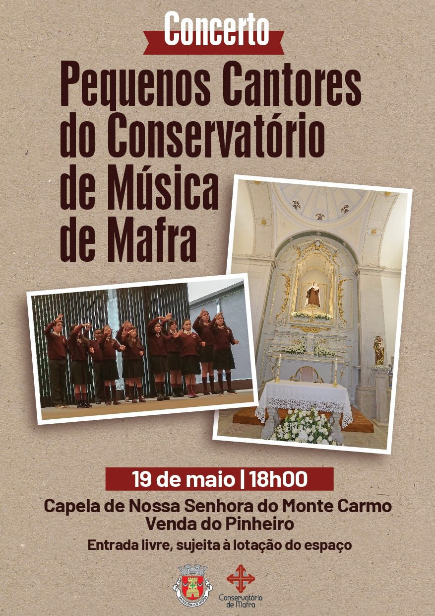 Os Pequenos Cantores do Conservatório de Música de Mafra apresentam-se em concerto, próximo dia 19 de maio, às 18h00, na Capela de N.ª Sr.ª do Monte Carmo, na Venda do Pinheiro.