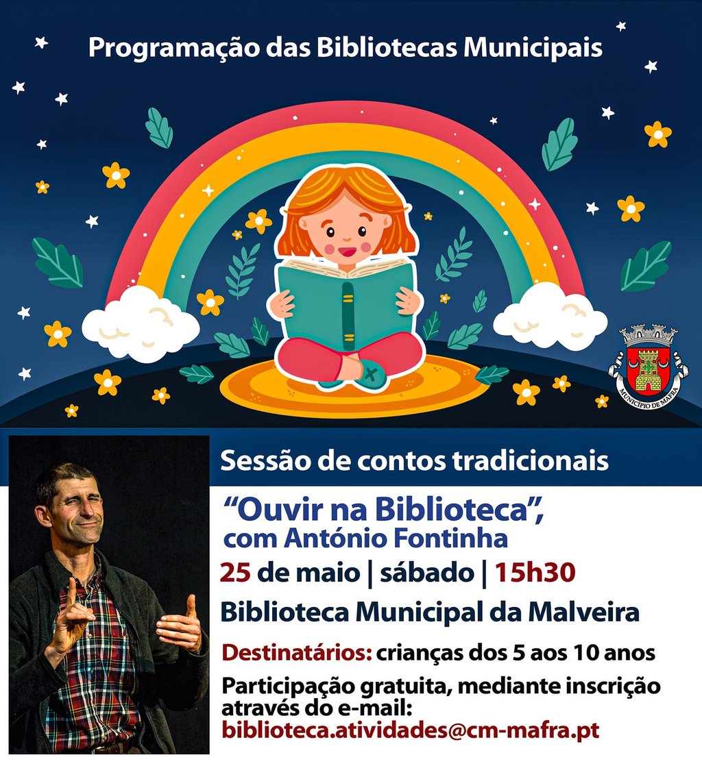 Os contos da tradição oral, contados por António Fontinha, regressam à Biblioteca Municipal da Malveira. A iniciativa “Ouvir na Biblioteca”, numa sessão especialmente dedicada a crianças dos 5 aos 10 anos, realiza-se no próximo dia 25 de maio, às 15h30.