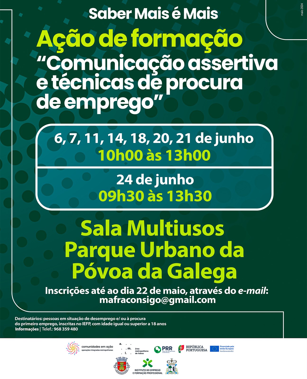 A Câmara Municipal de Mafra dinamiza a formação "Comunicação assertiva e técnicas de procura de emprego", nos dias 6, 7, 11, 14, 18, 20 e 21 de junho, das 10h00 às 13h00, e no dia 24 de junho, das 09h30 às 13h30, no Auditório do Parque Urbano da Póvoa da Galega.