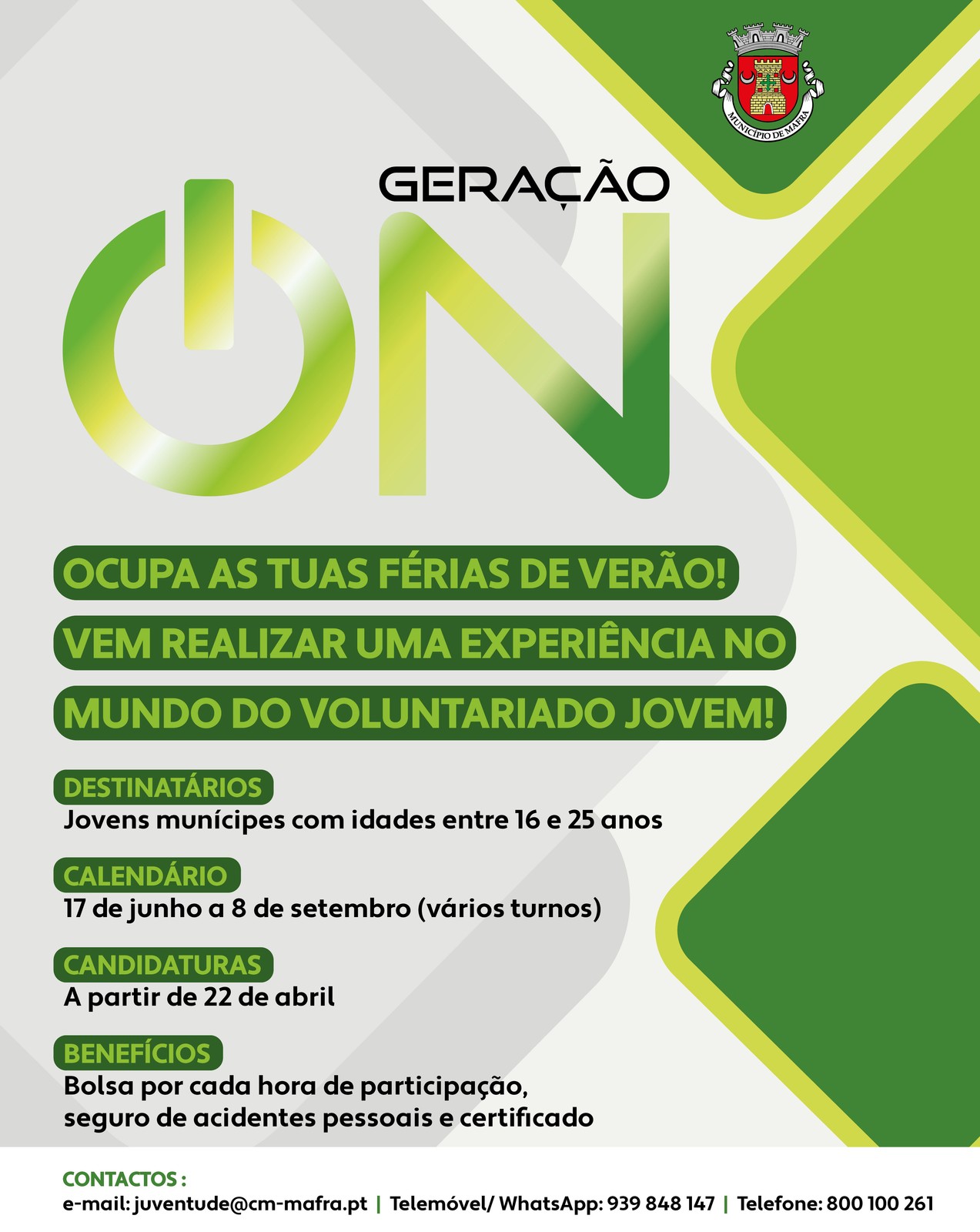 Já sabes como vais ocupar as tuas férias de verão? Vem realizar uma experiência no mundo do voluntariado jovem! Se tens entre 16 e 25 anos e resides no Concelho de Mafra, o projeto Geração ON Verão é a proposta ideal para ti. As candidaturas ainda estão a decorrer. Inscreve-te!