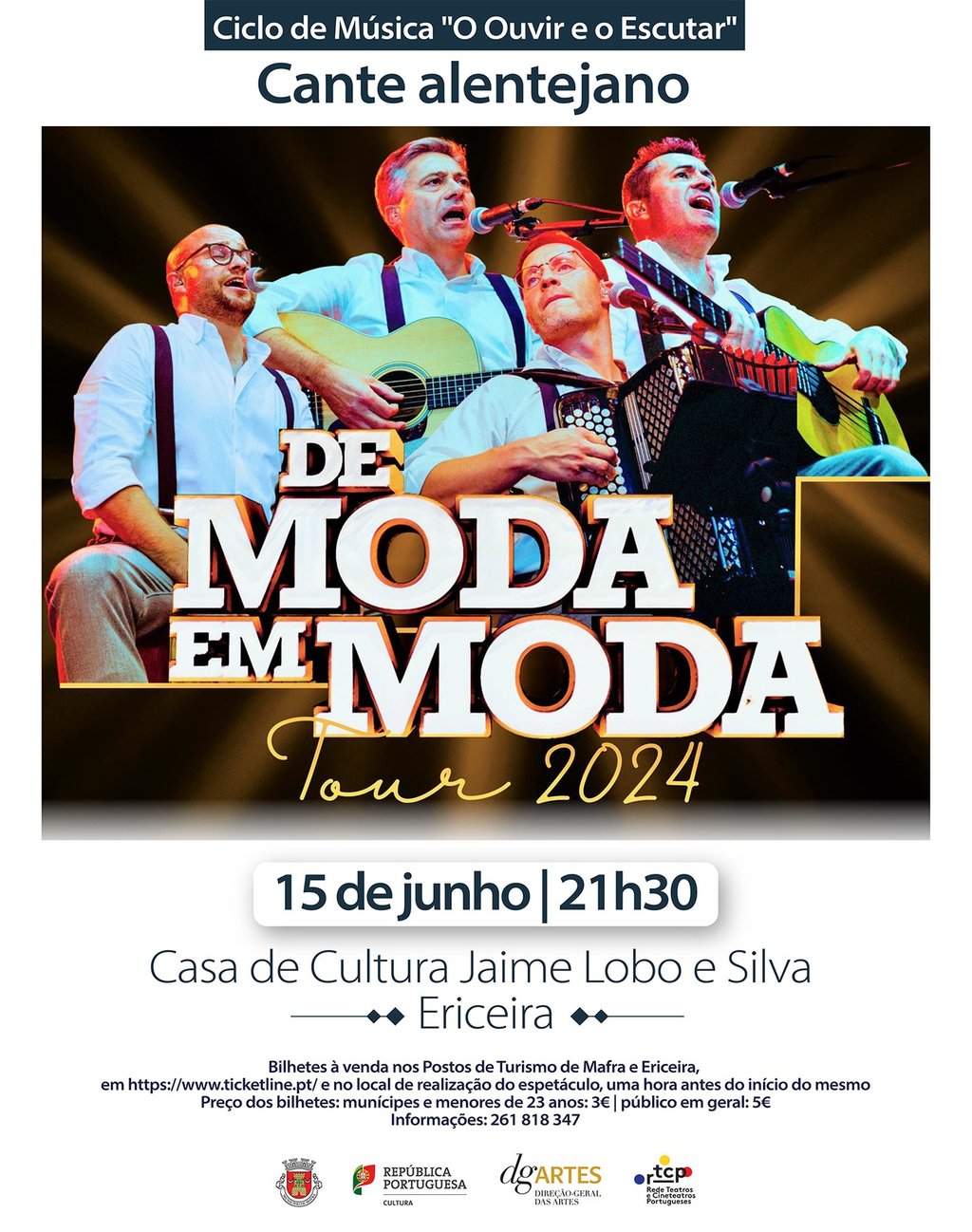 A música tradicional e o cante alentejano sobem ao palco da Casa de Cultura Jaime Lobo e Silva, na Ericeira, para mais um concerto do Ciclo de Música “O Ouvir e o Escutar”. O grupo De Moda em Moda, naturalmente alentejano, apresenta-se em concerto no dia 15 de junho, às 21h30.