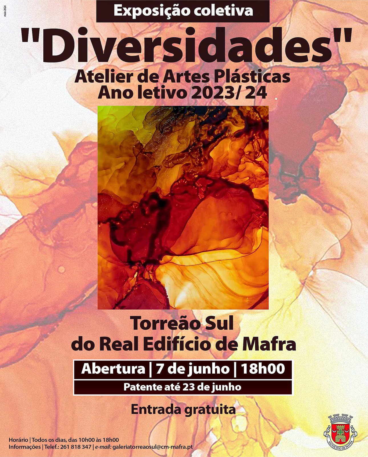 De 7 a 23 de junho, o Torreão Sul do Palácio Nacional de Mafra recebe a exposição coletiva “Diversidades”, com obras elaboradas pelos alunos do Atelier de Artes Plásticas da Câmara Municipal de Mafra. A abertura está marcada para o dia 7 de junho, às 18h00.