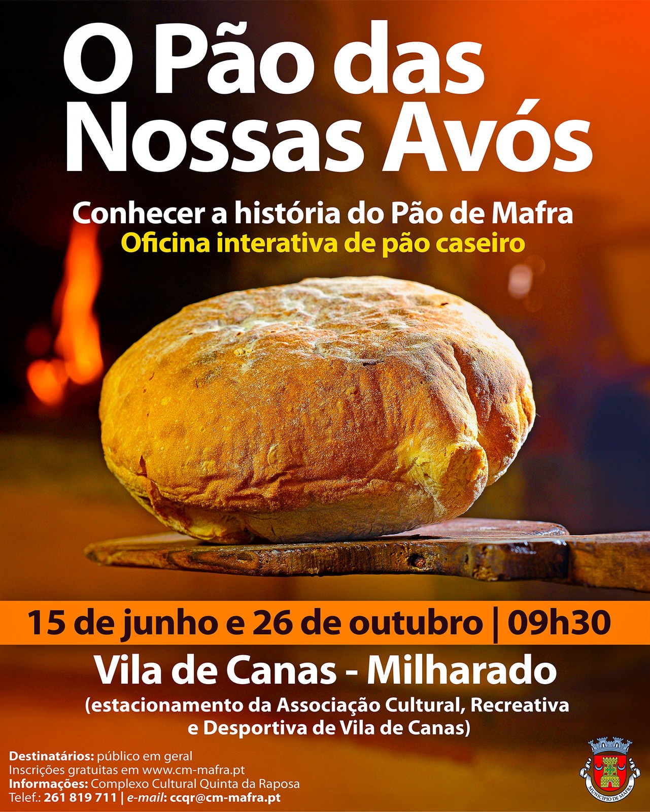 A localidade de Vila de Canas (Freguesia do Milharado) volta a receber uma atividade especial do “Pão das Nossas Avós”, nos dias 15 de junho e 26 de outubro, às 09h30. Esta iniciativa dá a conhecer o património cultural imaterial do concelho, através da visita a um moinho, seguida de uma oficina de fabrico de pão caseiro, orientada por um grupo de residentes da comunidade local.