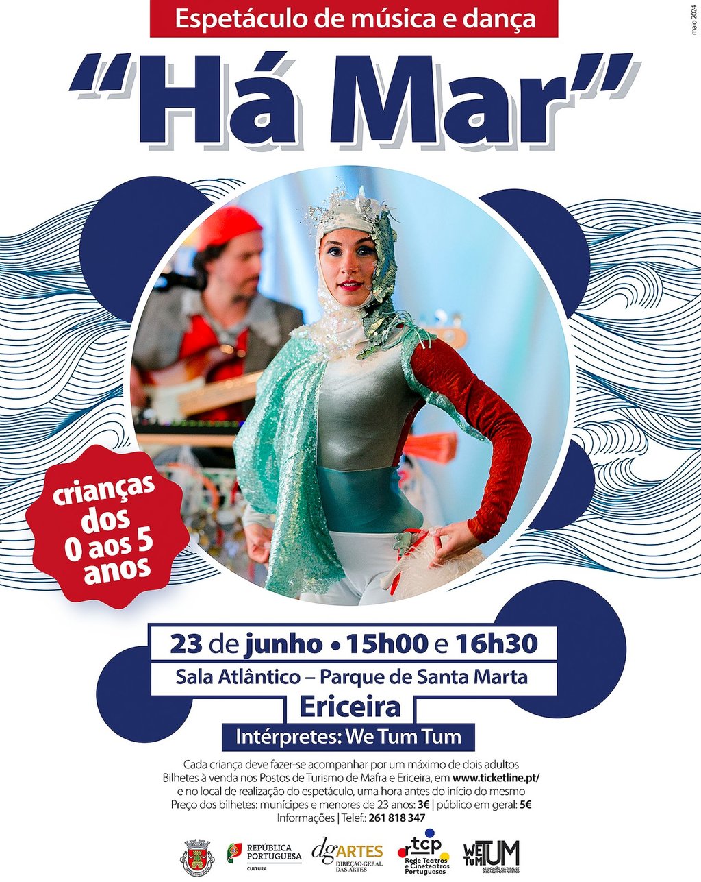 O espetáculo de música e dança “Há mar” leva bebés e crianças (até aos 5 anos) numa aventura pelas ondas do mar, entre cores, melodias e movimentos, à descoberta de ambientes marinhos que se encontram ameaçados, mas que ainda podem ser salvos. No dia 23 de junho, às 15h00 e às 16h30, traga as suas crianças e participe nesta viagem, na Sala Atlântico do Parque de Santa Marta (Ericeira).