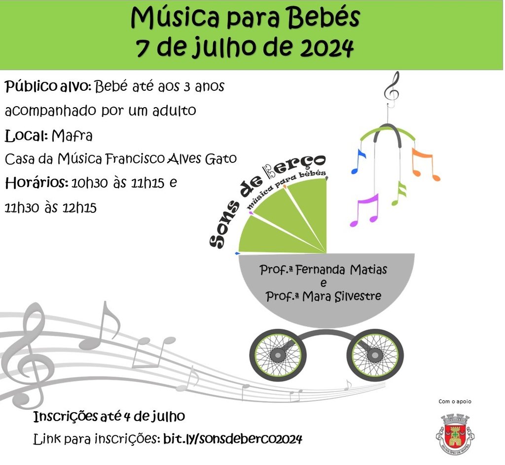 No próximo dia 7 de julho, a Casa da Música Francisco Alves Gato, em Mafra, acolhe mais uma atividade, destinada a bebés e crianças até aos 3 anos, acompanhadas de um adulto. A iniciativa “Música para Bebés” divide-se em duas sessões: às 10h30 e às 11h30.