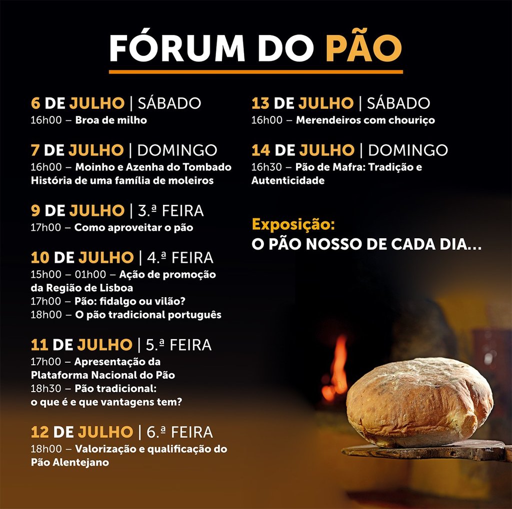 Integrado no recinto do Festival do Pão, que decorre de 5 a 14 de julho, no Jardim do Cerco (Mafra), o Fórum do Pão apresenta um programa de atividades focadas nos saberes e tradições gastronómicas, como sessões de showcooking, degustações e ações de sensibilização.
