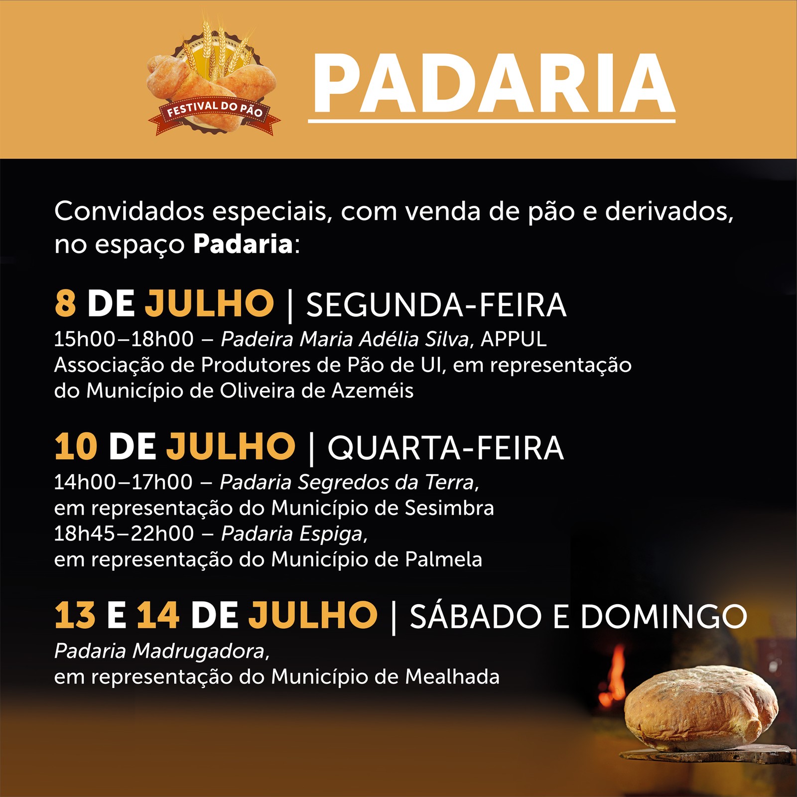 - 10 de julho, das 18h45 às 22h00 - Padaria Espiga, em representação do Município de Palmela;