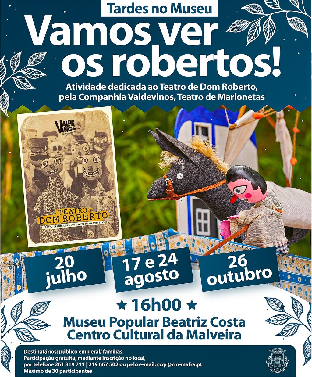 Vamos ver os robertos, no Museu Popular Beatriz Costa (Centro Cultural da Malveira)! Nos dias 20 de julho, 17 e 24 de agosto e 26 de outubro, às 16h00, participe nas sessões dedicadas ao “Teatro de Dom Roberto”, com a participação da Companhia Valdevinos, Teatro de Marionetas. A atividade integra uma visita ao Museu Popular Beatriz Costa, seguindo-se a exibição do Teatro de D. Roberto, no terraço do edifício.
