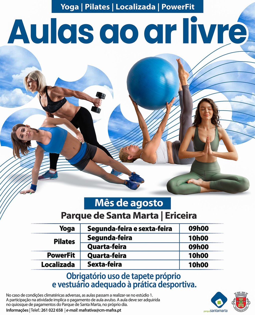 Yoga, Pilates, Powerfit e Localizada são as modalidades que os munícipes poderão experimentar, ao ar livre, durante o mês de agosto, no Parque de Santa Marta (Ericeira).