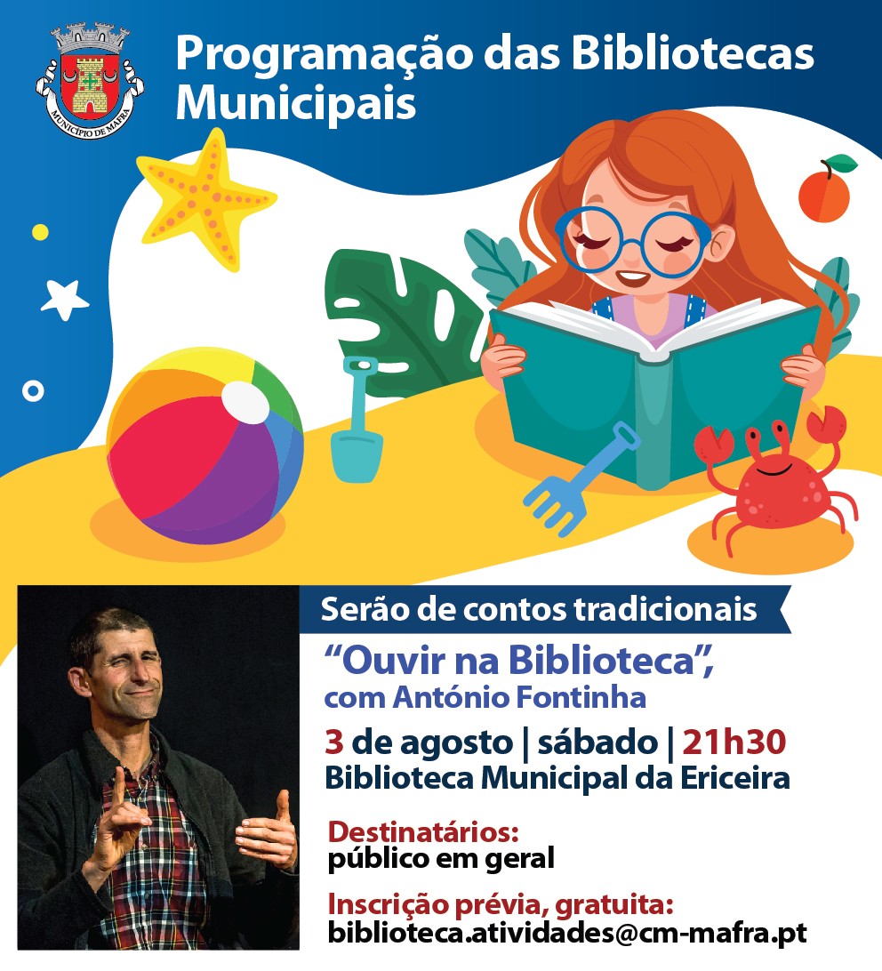Os contos da tradição oral, contados por António Fontinha, regressam à Biblioteca Municipal da Ericeira. Junte-se a nós, num serão de contos tradicionais “Ouvir na Biblioteca”, no próximo dia 3 de agosto, às 21h30.