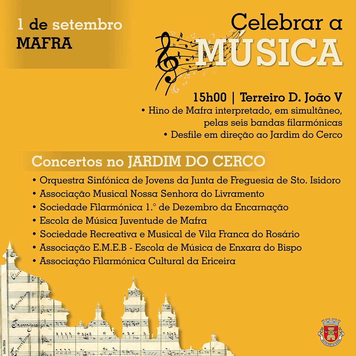 No dia 1 de setembro, o Município de Mafra celebra o Dia Nacional das Bandas Filarmónicas com a realização do evento “Celebrar a Música”. Tendo início com a interpretação do Hino de Mafra, às 15h00, no Terreiro D. João V (Mafra), tocado em simultâneo pelas seis bandas filarmónicas presentes, o programa continua no Jardim do Cerco, onde decorrerão os concertos por: