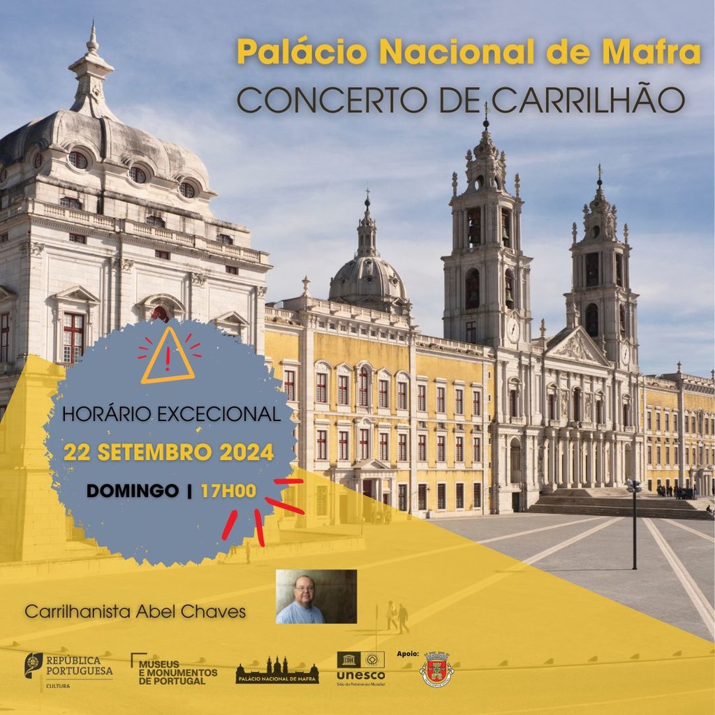 Realiza-se, no dia 22 de setembro, excecionalmente pelas 17h00, um concerto de carrilhão. O público pode ouvir, no Terreiro D. João V, em Mafra, alguns sucessos da música popular, intercalados com grandes clássicos da música portuguesa e internacional, interpretados pelo carrilhanista Abel Chaves.