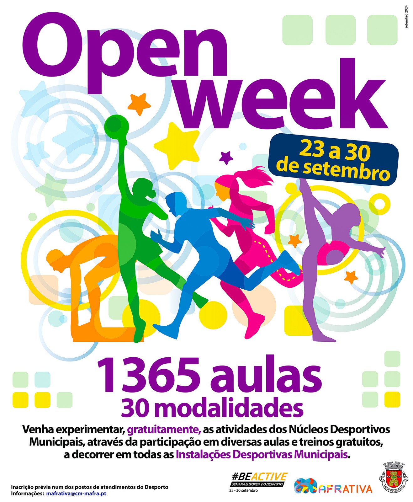 Venha experimentar as modalidades disponíveis nos núcleos desportivos municipais. A Câmara Municipal de Mafra promove a Open Week, associando-se à comemoração da Semana Europeia do Desporto. De 23 a 30 de setembro, são disponibilizadas, gratuitamente, 1365 aulas e 30 modalidades diferentes nas instalações desportivas municipais, dando a conhecer a diversidade da oferta proporcionada. Inscreva-se e participe!