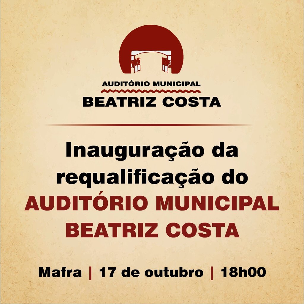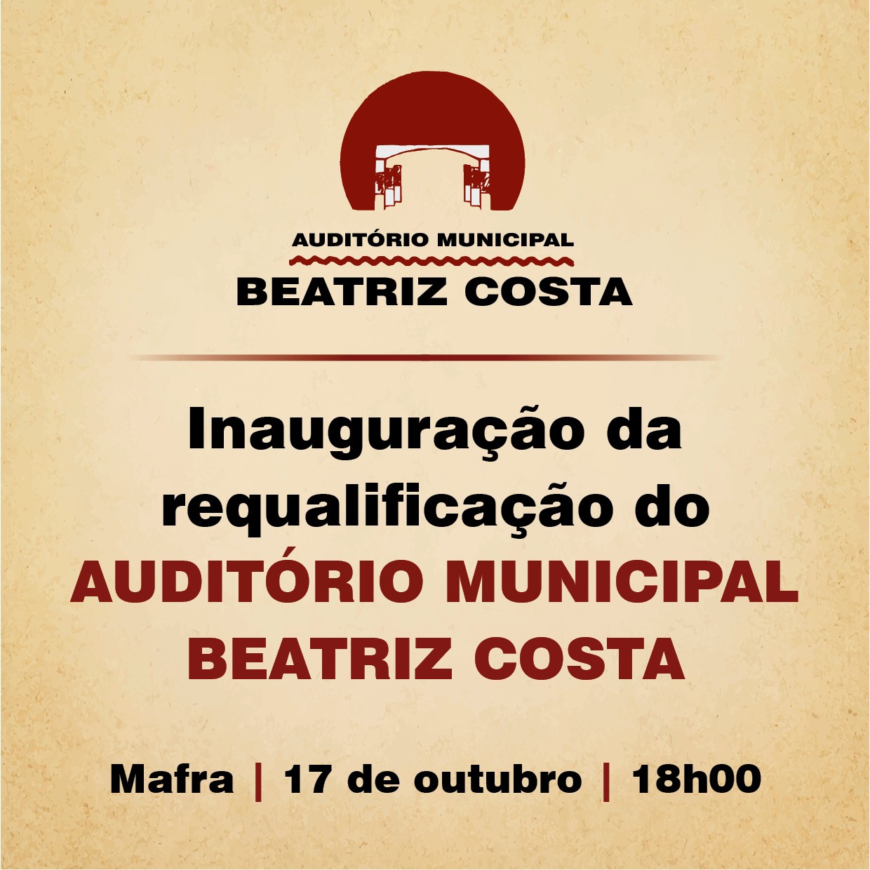 O Município de Mafra assinala a inauguração da requalificação do Auditório Municipal Beatriz Costa, em Mafra, no dia 17 de outubro, às 18h00. Neste âmbito, terá lugar um programa de comemorações, que se estende até ao dia 19 de outubro.