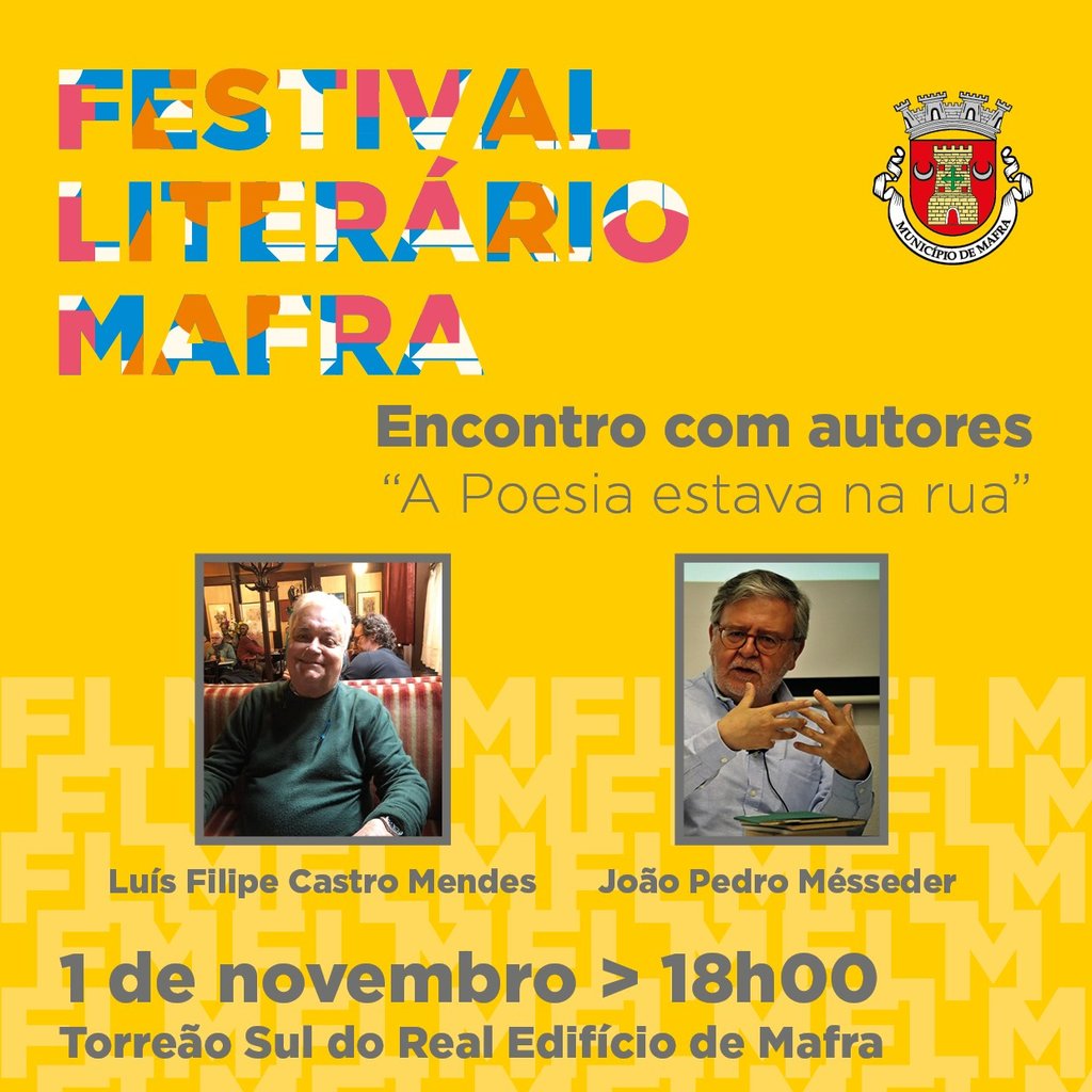 “A Poesia estava na rua” é o tema do segundo encontro com autores do Festival Literário de Mafra. Luís Filipe Castro Mendes e João Pedro Mésseder vão estar presentes no dia 1 de novembro, às 18h00, no Torreão Sul do Real Edifício de Mafra.