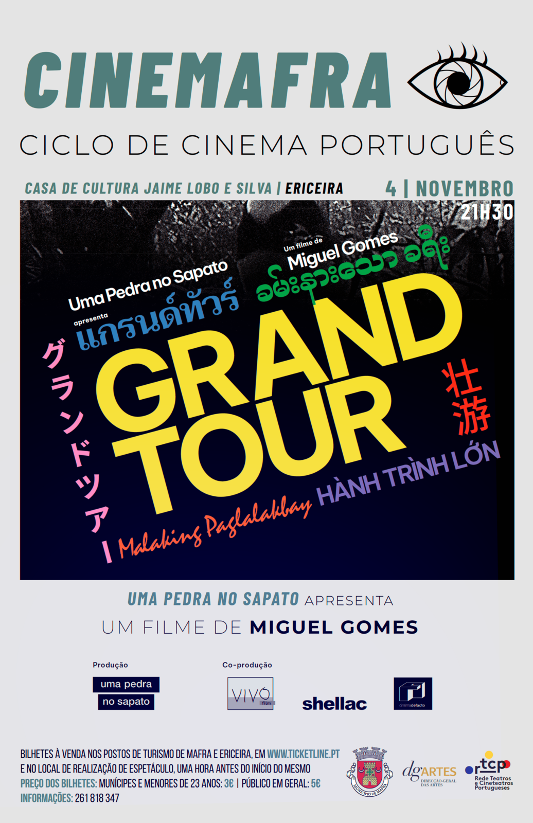 O mês de novembro traz novas sessões de cinema à Casa de Cultura Jaime Lobo e Silva, na Ericeira! "Grand Tour", do realizador Miguel Gomes, é o título do filme que será exibido na sessão de abertura do CineMafra – Ciclo de Cinema Português, no dia 4 de novembro, às 21h30.