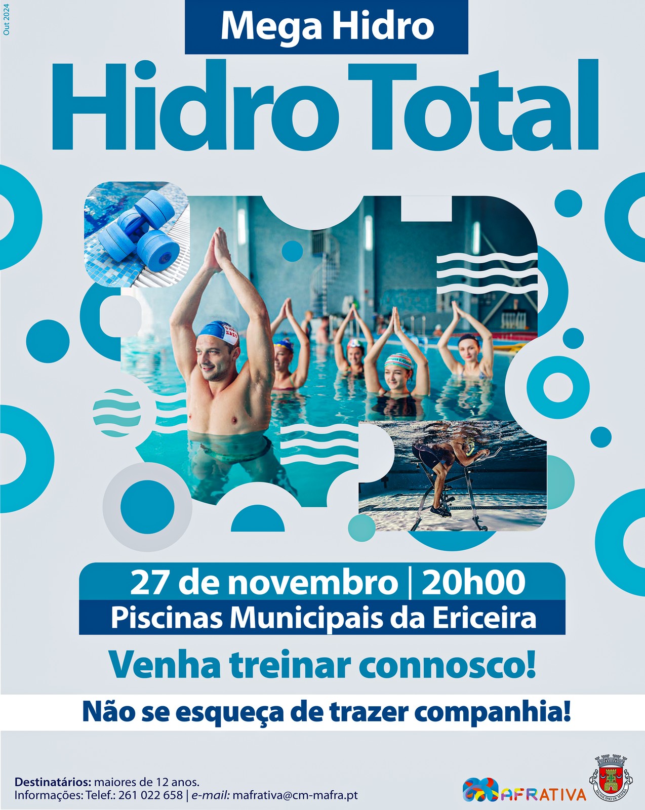 Venha desafiar os seus limites! Desfrute, gratuitamente, de uma aula de hidroginástica, nas Piscinas Municipais da Ericeira. A “Hidro Total” está marcada para o dia 27 de novembro, às 20h00.