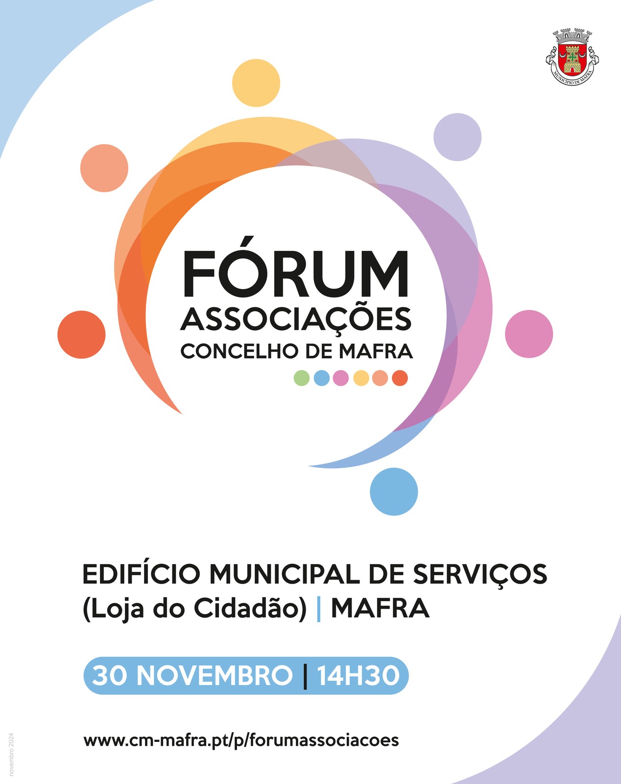 Um evento destinado a todos os agentes e representantes associativos do Concelho de Mafra. O Fórum das Associações está de regresso para mais uma edição do evento que pretende apoiar estas entidades, fornecendo-lhes instrumentos auxiliares para organização e gestão das suas atividades. O encontro realiza-se no próximo dia 30 de novembro, às 14h30, no Edifício Municipal de Serviços (Loja do Cidadão), em Mafra.