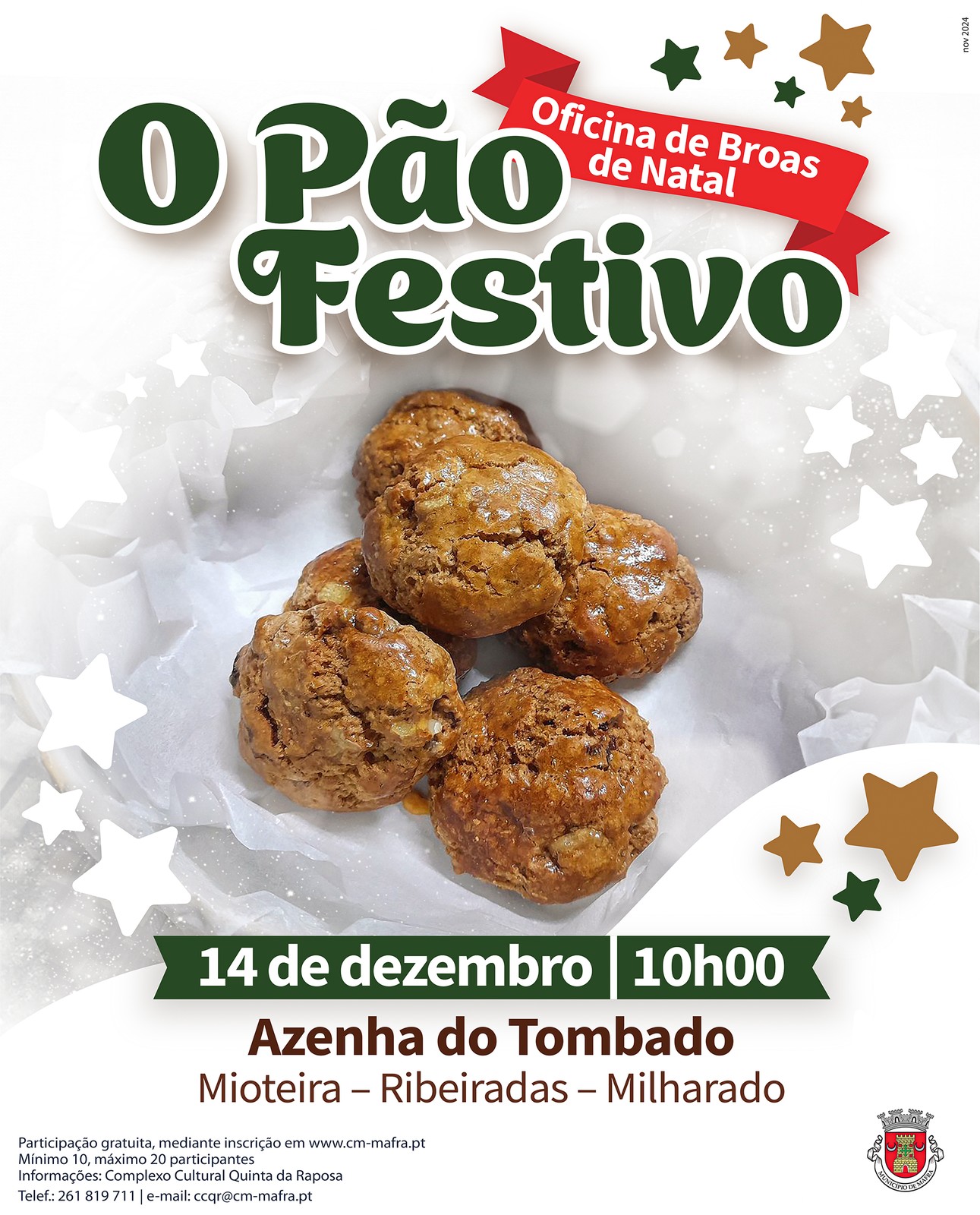 Nesta quadra, a atividade “O Pão Festivo” volta a celebrar as conhecidas broas de Natal de feição rural. Descubra esta tradição e participe na oficina de fabrico de broas de Natal, orientada por grupo de pessoas da comunidade local de Vila de Canas, no dia 14 de dezembro, às 10h00, na Azenha do Tombado, na localidade de Mioteira – Ribeiradas (Freguesia do Milharado).