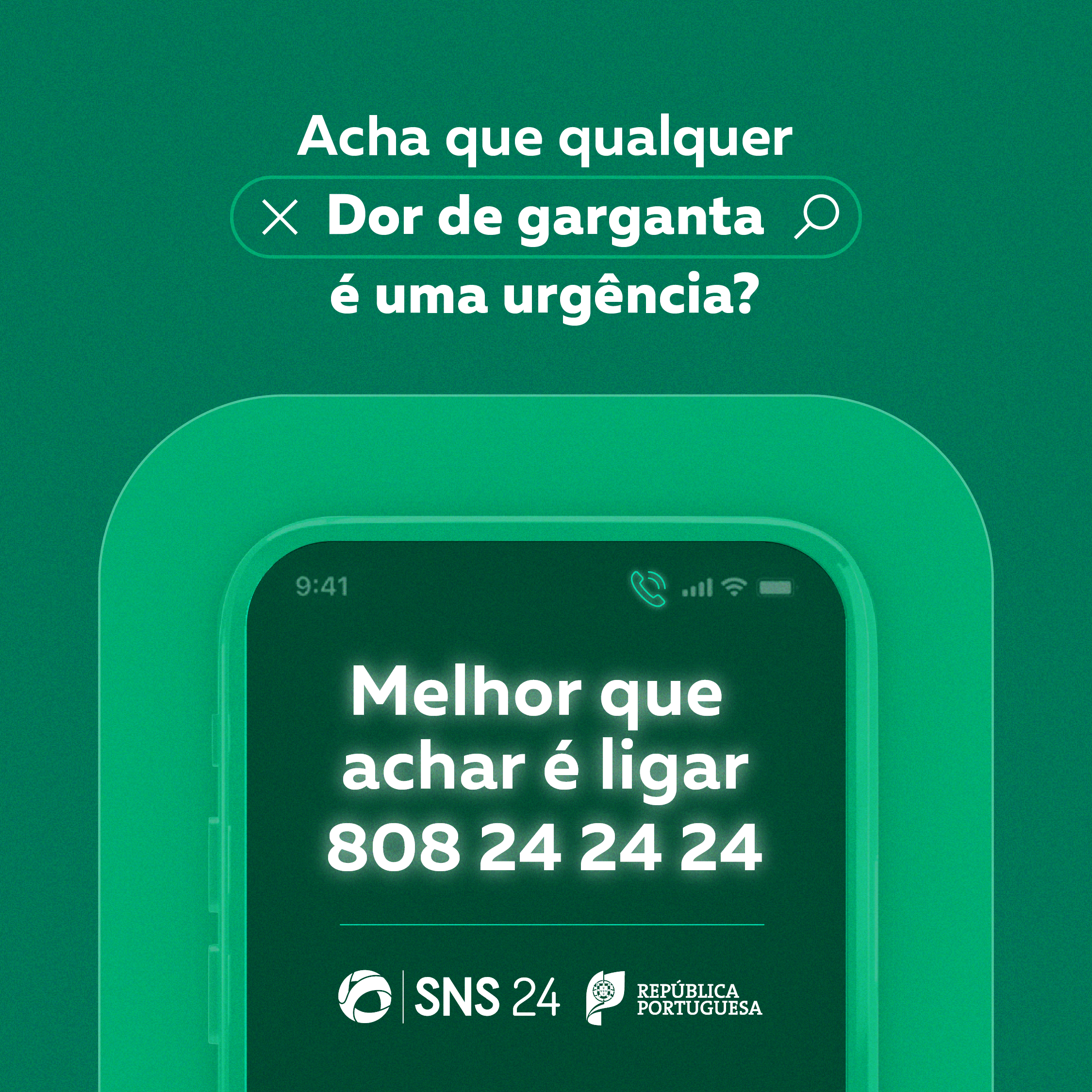 Acha que qualquer dor de garganta ou de costas é uma urgência? Melhor do que achar, é ligar 808 24 24 24. Evite deslocações desnecessárias aos serviços de urgência hospitalares. Se tem sintomas de doença não emergente, mas que necessitam de aconselhamento e/ou encaminhamento, deve sempre ligar para a linha de saúde SNS 24, antes de tomar qualquer decisão.