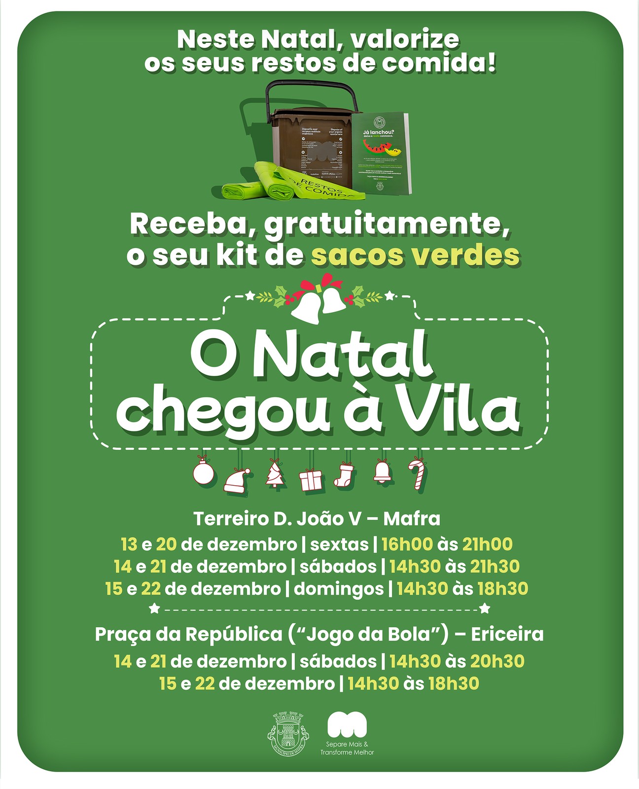 O projeto “Separe Mais & Transforme Melhor” vai ser divulgado no evento “O Natal chegou à Vila”! Conheça as datas e horários dos postos móveis, faça a sua inscrição e receba, gratuitamente, um pequeno contentor castanho, dois rolos de sacos de cor verde e um folheto explicativo. Se já participa no projeto, receba, gratuitamente, recargas de rolos de sacos verdes.