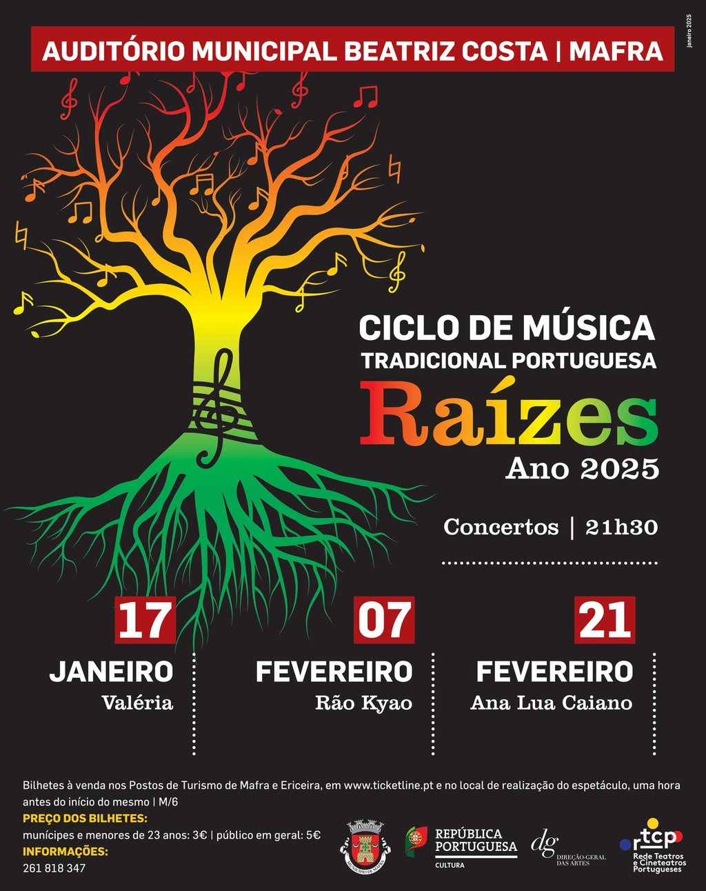 De 17 de janeiro a 21 de fevereiro, o Ciclo de Música Tradicional Portuguesa “Raízes” regressa ao Auditório Municipal Beatriz Costa (Mafra), com um programa de concertos diversificados, por Valéria (17 de janeiro), Rão Kyao (7 de fevereiro - ESGOTADO) e Ana Lua Caiano (21 de fevereiro). Os concertos realizam-se sempre às 21h30.