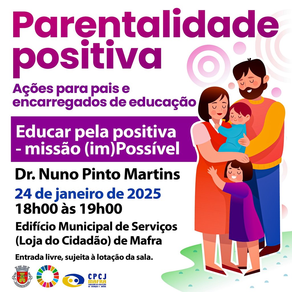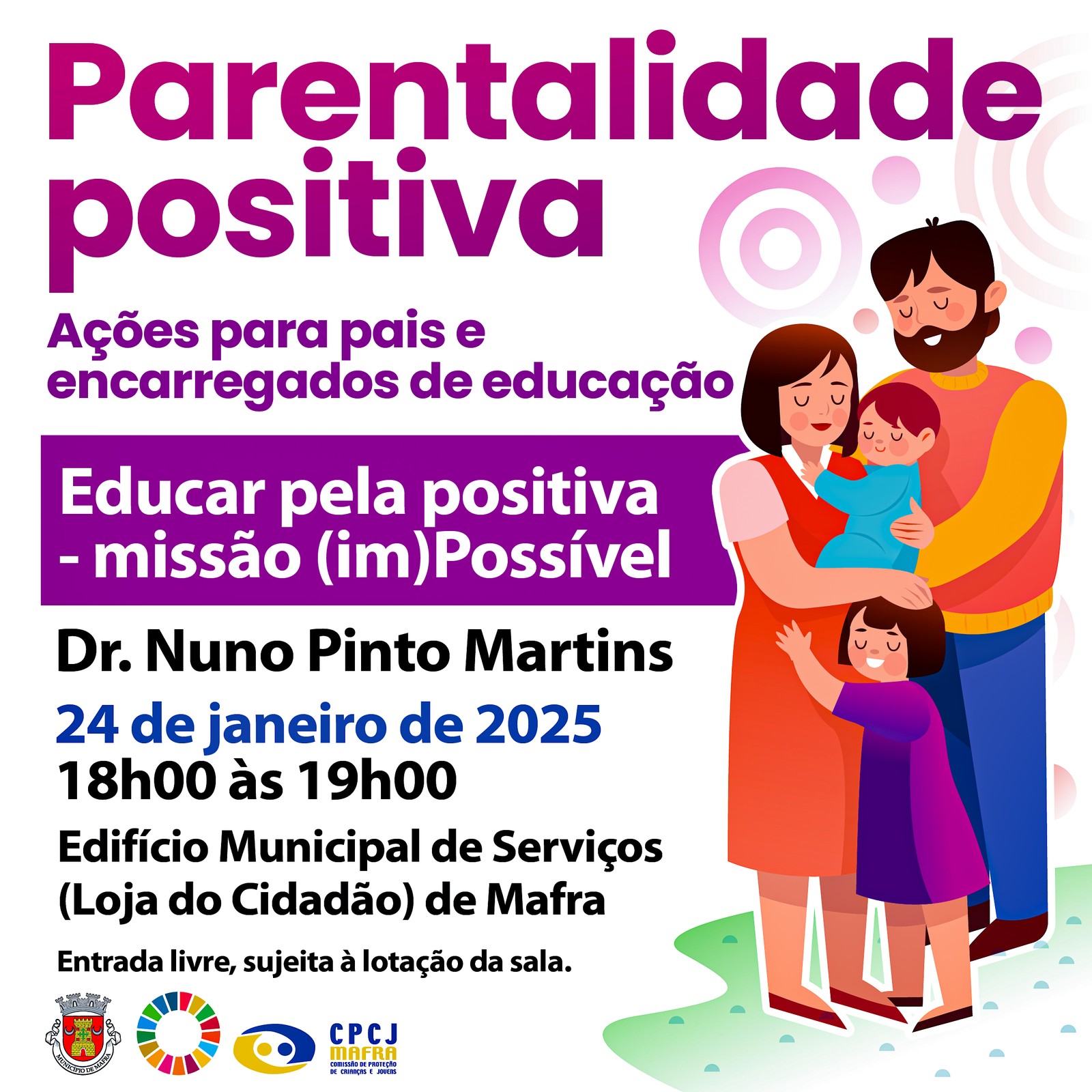 “Educar pela positiva - missão (im)possível” é o tema da próxima sessão sobre “Parentalidade positiva”, que se realiza no dia 24 de janeiro, das 18h00 às 19h00, no Edifício Municipal de Serviços (Loja do Cidadão) de Mafra. A entrada é livre, sujeita à lotação da sala.