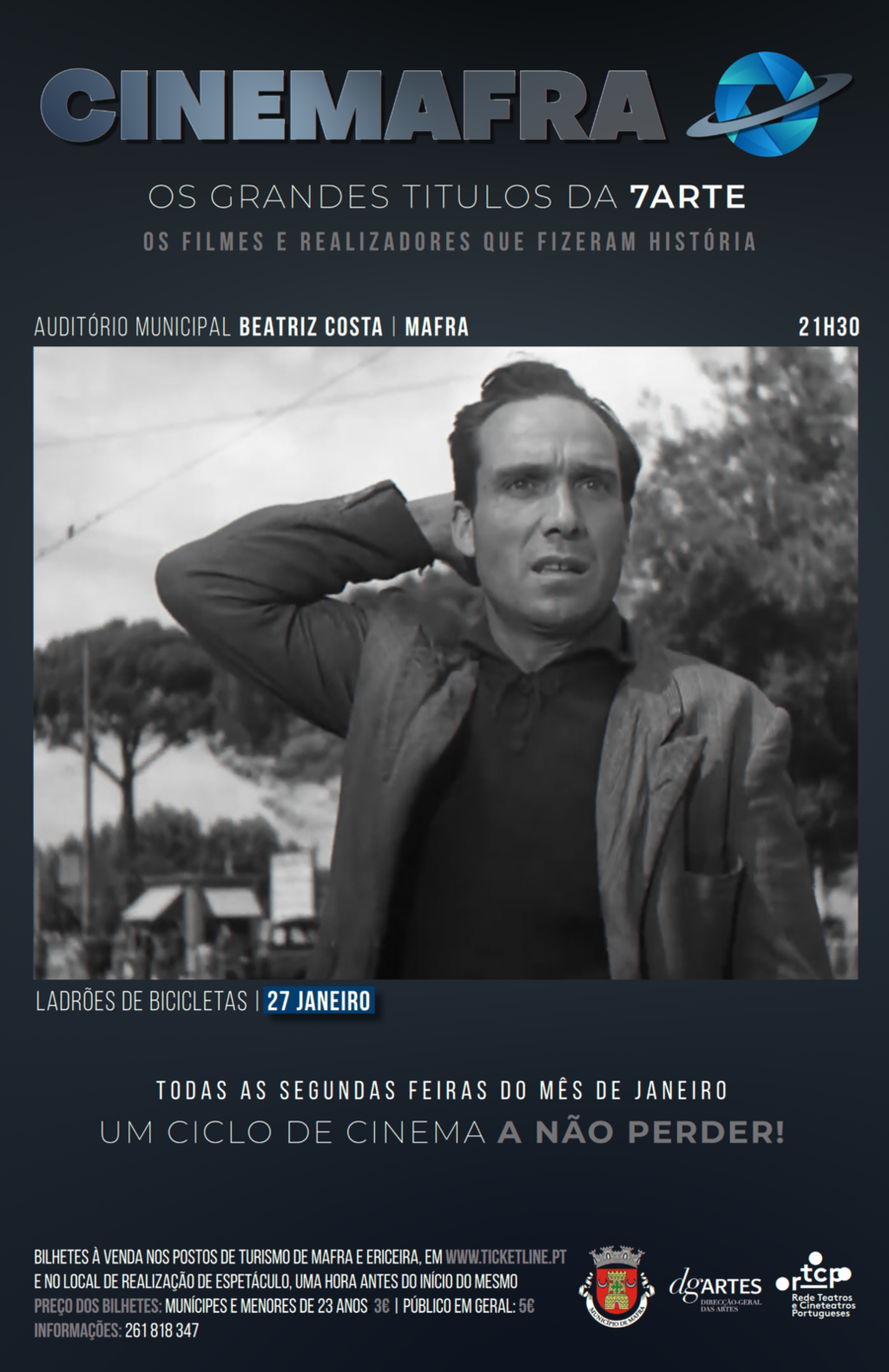 “Ladrões de Bicicletas”, um clássico do cinema italiano, que conta a história de pai e filho na Roma do pós-guerra, é o próximo filme em exibição, no Auditório Municipal Beatriz Costa (Mafra). Não perca, mais uma sessão CineMafra, no dia 27 de janeiro, às 21h30.