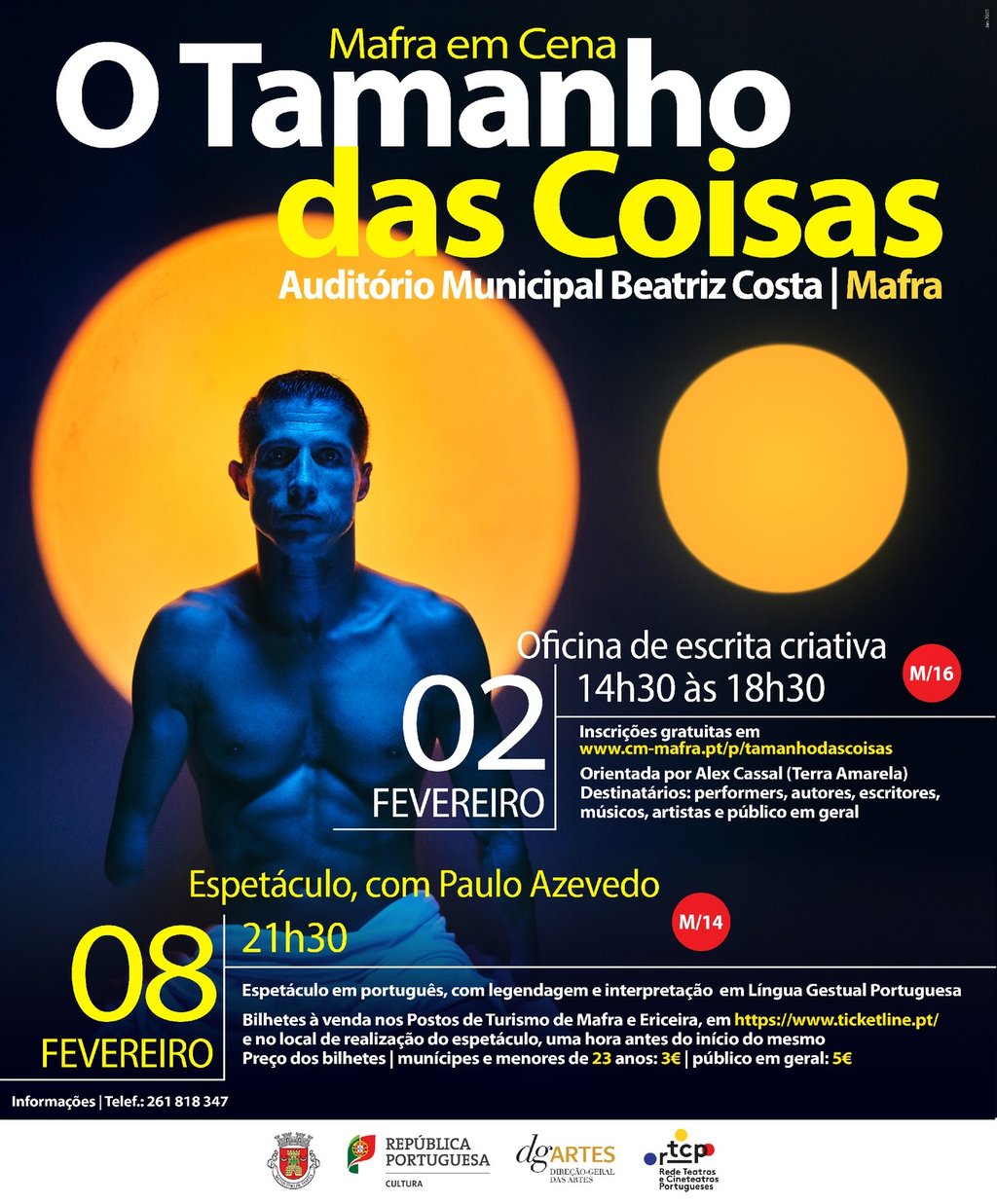 No dia 8 de fevereiro, pelas 21h30, o ator Paulo Azevedo sobe ao palco do Auditório Municipal Beatriz Costa (Mafra), para protagonizar a peça “O Tamanho das Coisas”, um monólogo de um viajante, que não sabe se deve continuar a sua jornada, devido a duas grandes questões. Poderão todas as coisas medir a sua importância pela sua escala de tamanho? Será que nos vemos como gigantes?