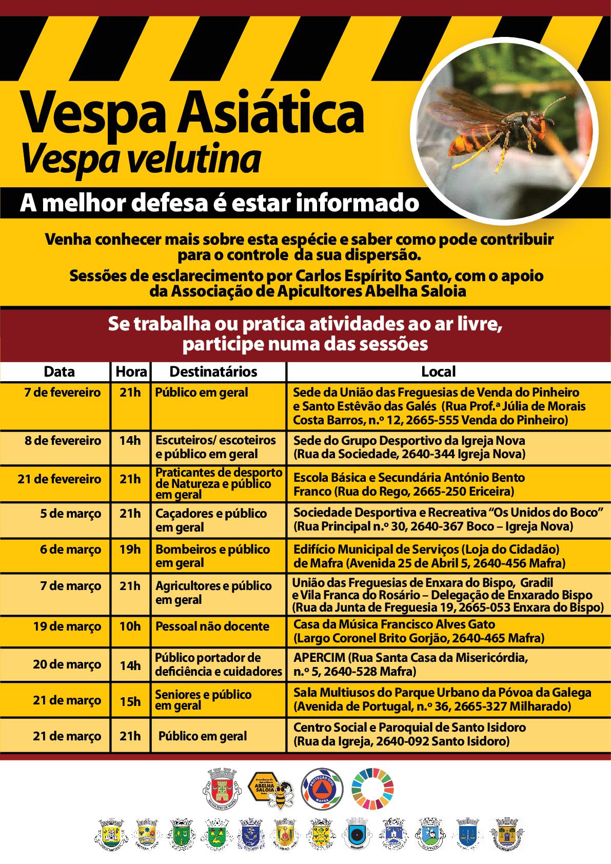 De 7 de fevereiro a 21 de março, estarão a decorrer sessões de esclarecimento e de informação para o combate à Vespa Asiática/ Velutina, em várias freguesias do Concelho de Mafra. Descubra como pode contribuir para o controle desta espécie invasora e como deve agir perante o avistamento de uma Vespa ou de um ninho. A participação não carece de inscrição prévia.