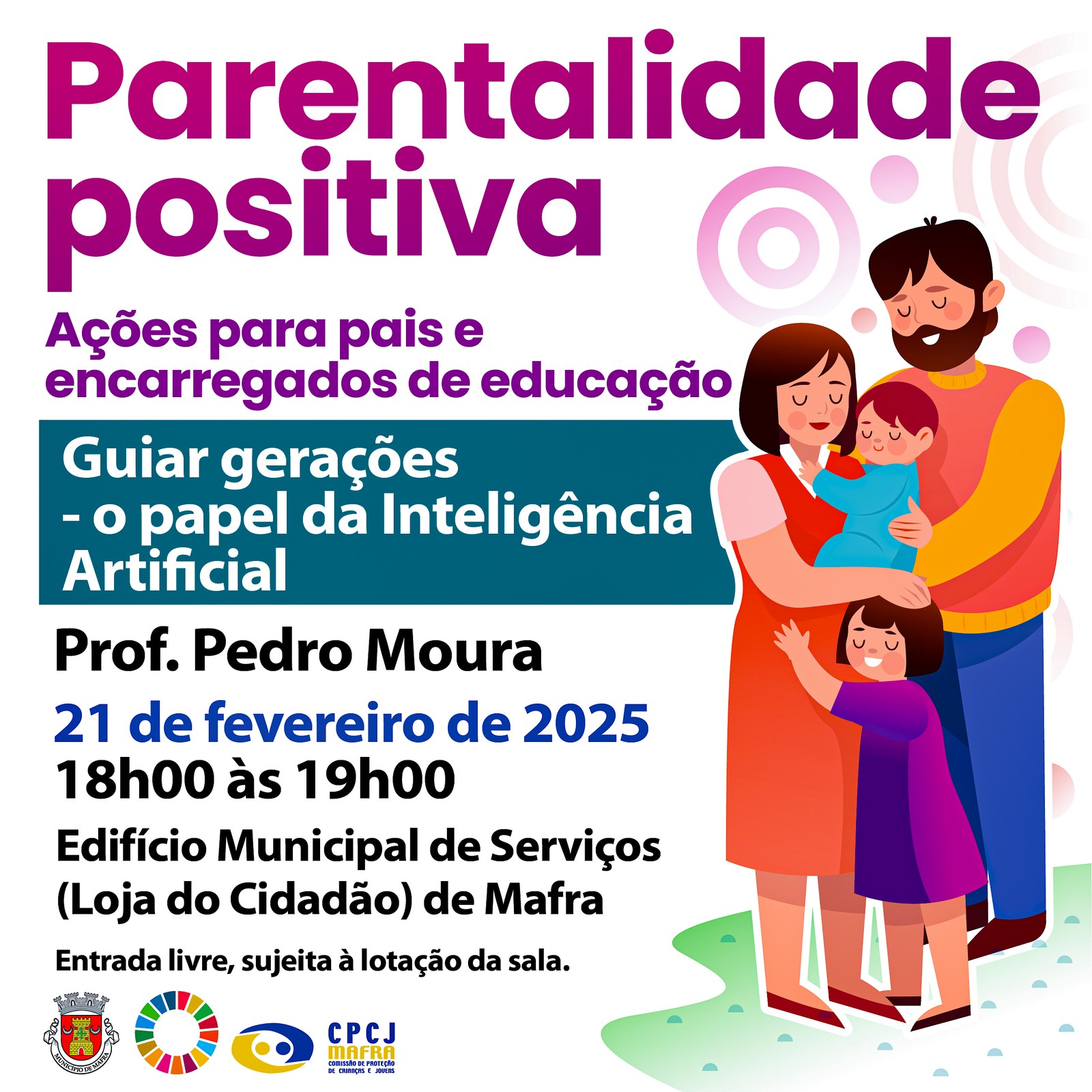 “Guiar gerações – o papel da Inteligência Artificial” é o tema da próxima sessão sobre “Parentalidade positiva”, que se realiza no próximo dia 21 de fevereiro, das 18h00 às 19h00, no Edifício Municipal de Serviços (Loja do Cidadão) de Mafra. A entrada é livre, sujeita à lotação da sala.