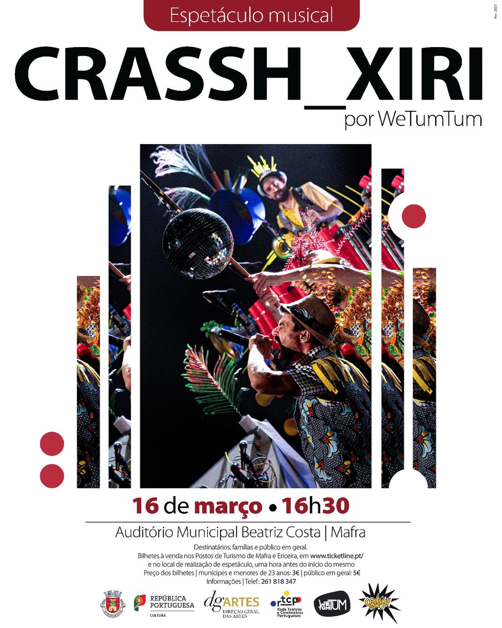“CRASSH_XIRI” é o espetáculo que promete animar miúdos e graúdos, numa tarde repleta de humor, boa disposição e sonoridades eletrónicas. O espetáculo, apresentado pela companhia WeTumTum, no idioma “crasshonês”, sobe ao palco do Auditório Municipal Beatriz Costa (Mafra), no dia 16 de março, às 16h30, para apresentar versões especiais de músicas intemporais.