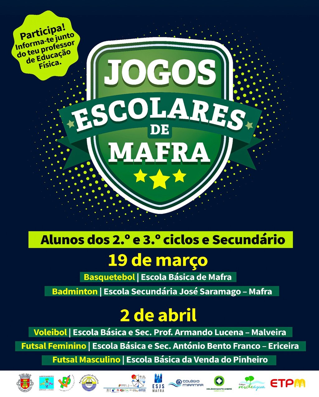 És aluno do 2.º e 3.º ciclo ou do ensino secundário e gostas de praticar Desporto? Participa nos Jogos Escolares de Mafra, nos dias 19 de março e 2 de abril, que estarão a decorrer em várias escolas do Concelho de Mafra.
