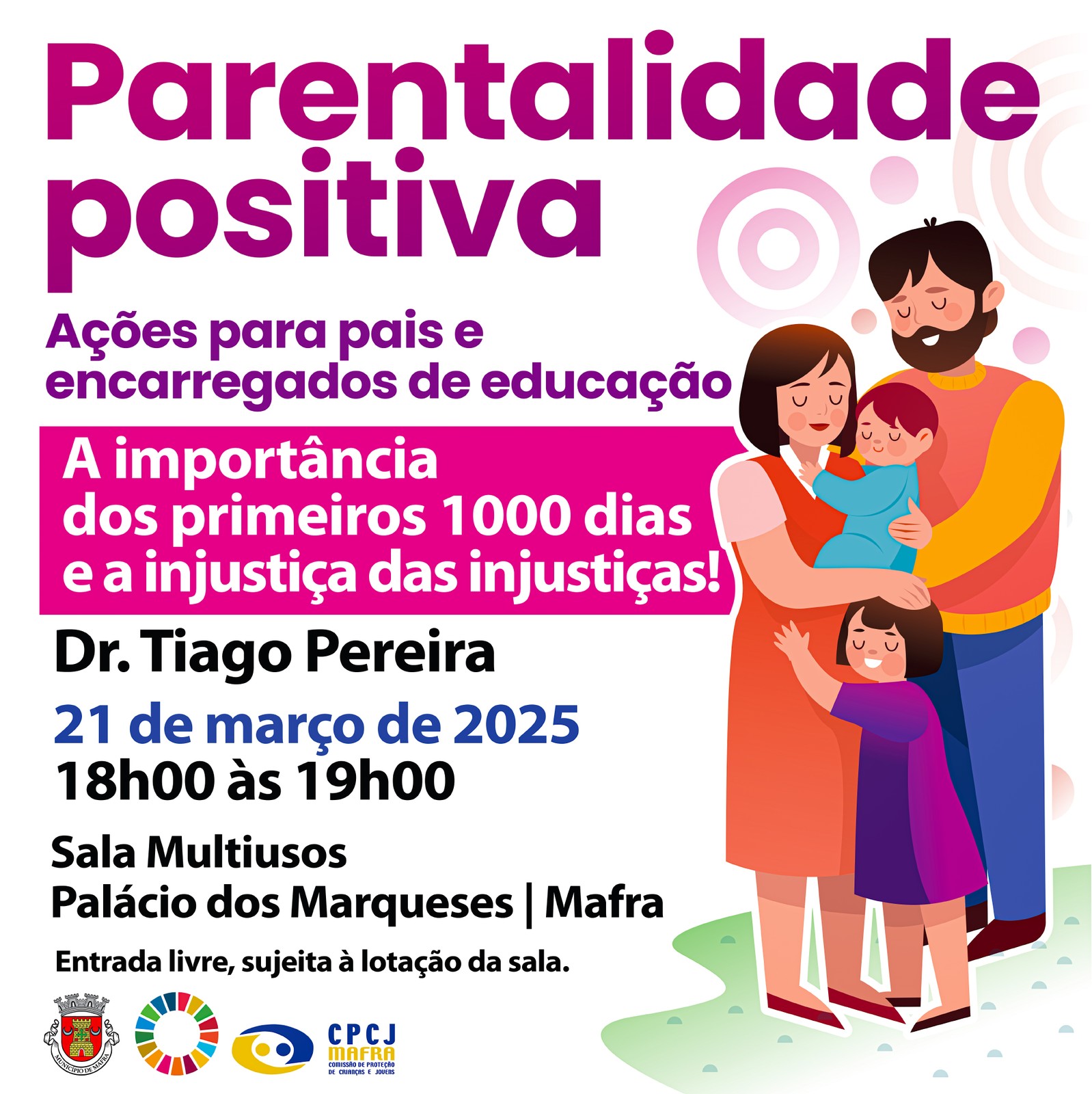 A Sala Multiusos do Palácio dos Marqueses (Mafra) recebe a próxima iniciativa sobre “Parentalidade positiva”, a qual estava prevista realizar-se na Casa de Cultura Jaime Lobo e Silva (Ericeira). Sob o tema “A importância dos primeiros 1000 dias e a injustiça das injustiças!”, a sessão decorre no dia 21 de março, às 18h00.
