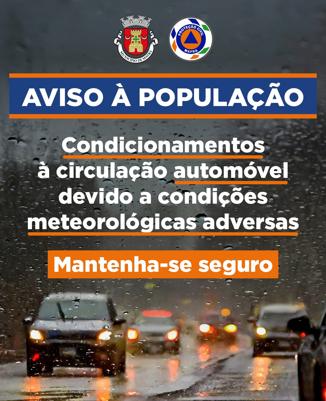 ÚLTIMA ATUALIZAÇÃO | 11h00, 11 de março | O Serviço Municipal de Proteção Civil informa sobre a existência de condicionamentos à circulação automóvel no Concelho de Mafra, em resultado das condições meteorológicas adversas.