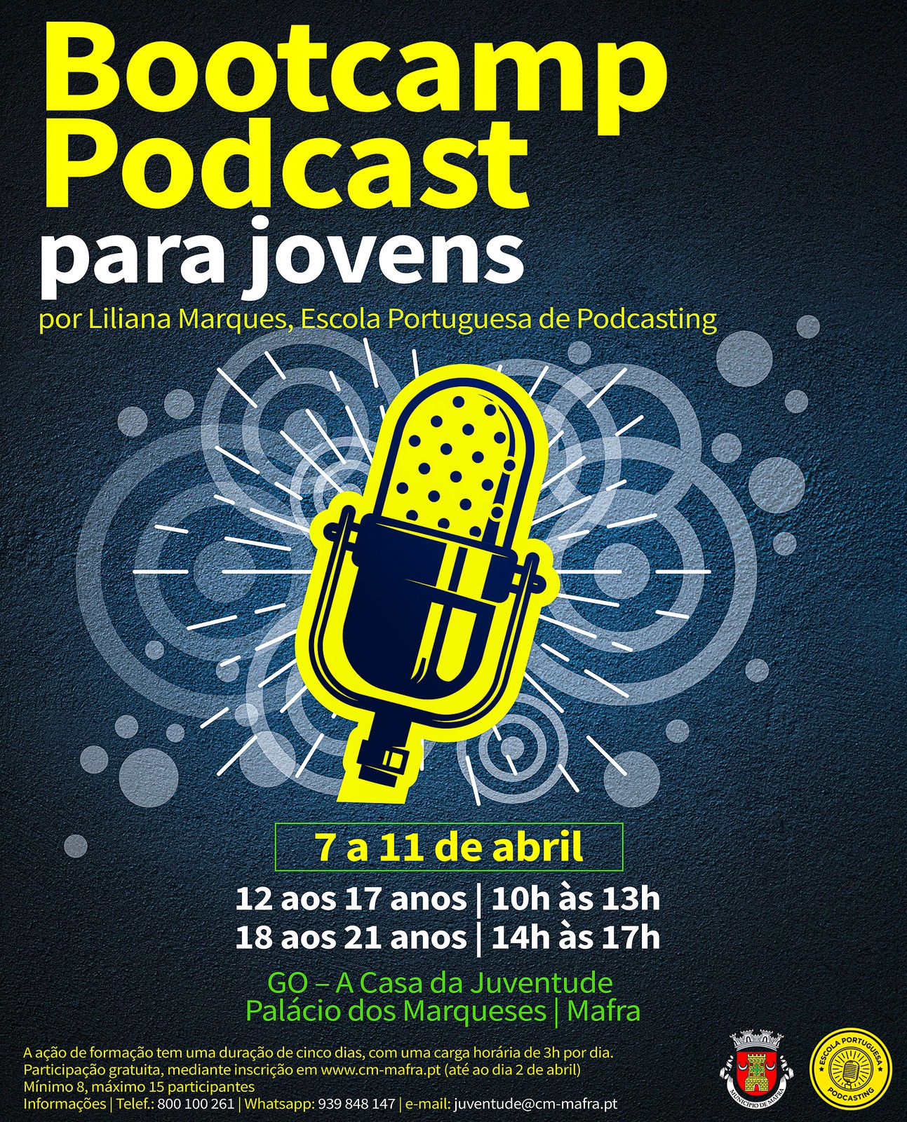 Tens entre 12 e 21 anos e gostavas de descobrir o mundo do Podcast? Participa no Bootcamp de Podcast para jovens, que temos preparado para ti! De 7 a 11 de abril, o estúdio de Podcast da Casa da Juventude (Palácio dos Marqueses, Mafra) recebe uma formação dedicada à criação de conteúdos, técnicas de gravação e edição de podcasts.