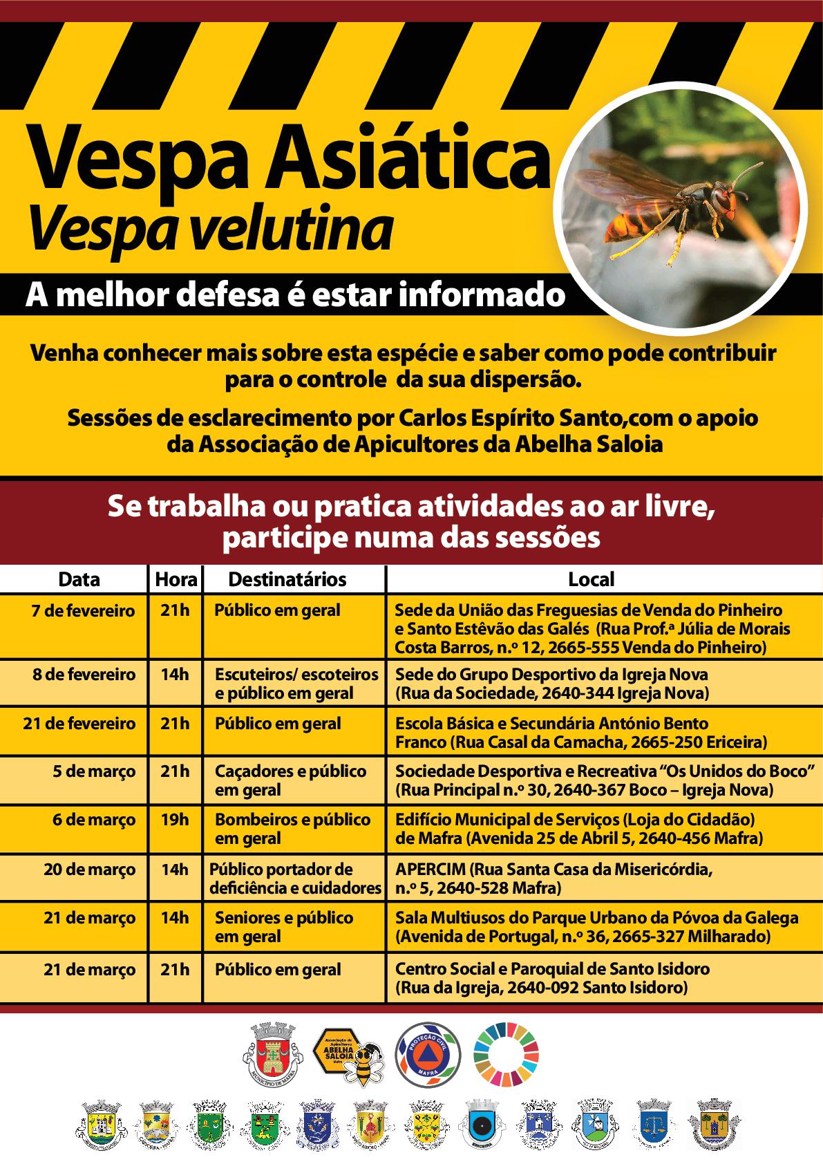 Mafra, Póvoa da Galega e Santo Isidoro. Assista às sessões de esclarecimento e de informação para o combate à Vespa Asiática/ Velutina, dinamizadas por Carlos Espírito Santo, da Associação de Apicultores da Abelha Saloia. Descubra como pode contribuir para o controle desta espécie invasora e como deve agir perante o avistamento de uma Vespa ou de um ninho. A participação não carece de inscrição prévia.