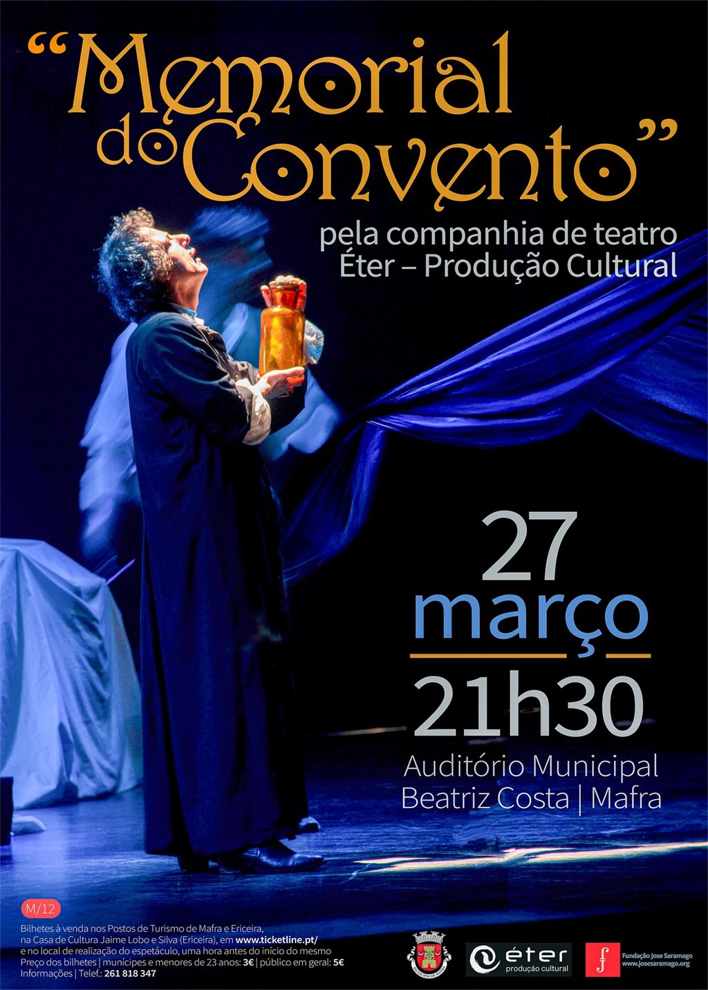 Bilhetes à venda nos Postos de Turismo de Mafra e Ericeira, na Casa de Cultura Jaime Lobo e Silva (Ericeira), em www.ticketline.pt/evento/eter-memorial-do-convento-92308 e no local de realização do espetáculo, duas horas antes do início do mesmo.
