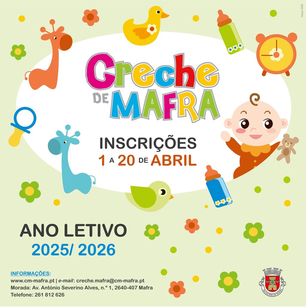 De 1 a 20 de abril, poderá inscrever o seu educando na Creche Municipal de Mafra, para o ano letivo de 2025/2026, preenchendo o “Boletim de Inscrição na Creche de Mafra”, disponível em https://www.cm-mafra.pt/pages/702, entre os dias 1 e 20 e abril.