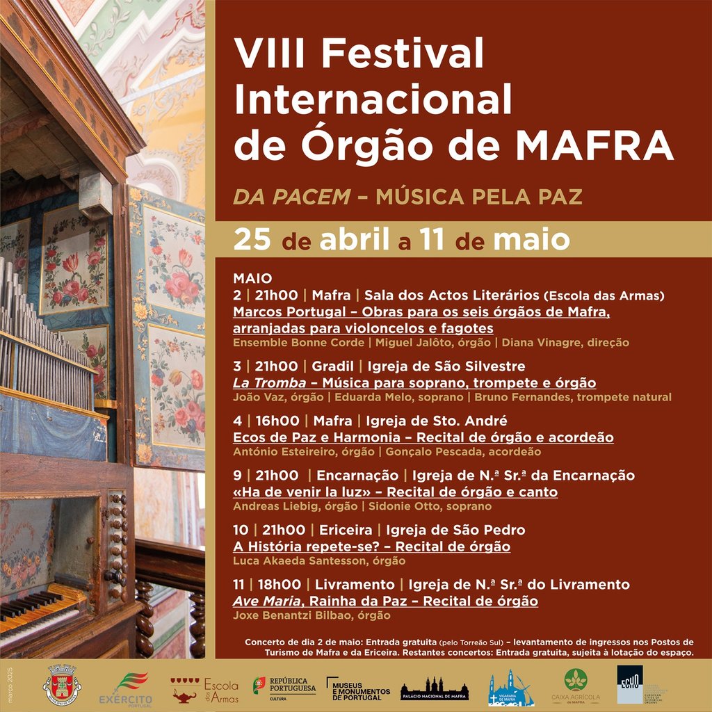 De 25 de abril a 11 de maio, está de regresso o Festival Internacional de Órgão de Mafra! “Da Pacem – Música pela Paz” é o tema da 8.ª edição do programa que, em homenagem ao Papa Francisco, reúne organistas nacionais e internacionais, com concertos e recitais em diversas igrejas do Concelho de Mafra e, também, na Sala dos Actos Literários (Escola das Armas), em Mafra.