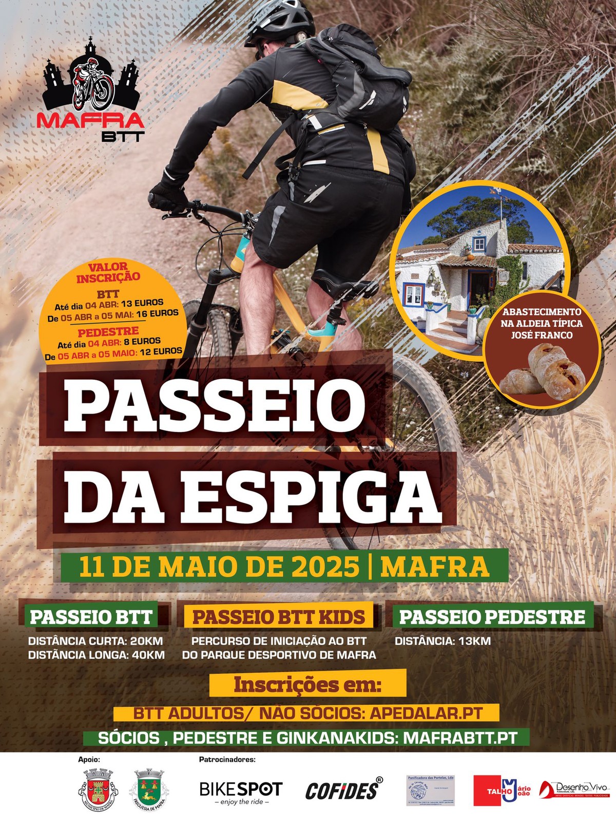No dia 11 de maio, Mafra recebe mais uma edição do “Passeio da Espiga”, um evento desportivo e de convívio, para os amantes de BTT, de passeios pedestres e da Natureza. O percurso divide-se em três distâncias: 20km (curto), 40km (longo) e 13km (passeio pedestre). Para os mais pequenos (dos 5 aos 13 anos), decorrerá uma Ginkanakids, no percurso de iniciação ao BTT do Parque Desportivo Municipal de Mafra. A inscrições estão abertas até ao dia 5 de maio.