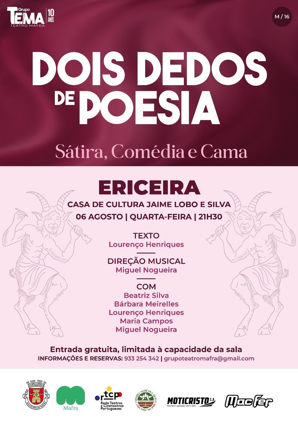 Sátira, Comédia e Cama. O Grupo TEMA – Teatro Mafra traz uma sessão especial da tertúlia “Dois Dedos de Poesia”, num espetáculo que junta a poesia, a sátira e o burlesco. Não perca, no dia 6 de agosto, às 21h30, na Casa de Cultura Jaime Lobo e Silva (Ericeira).