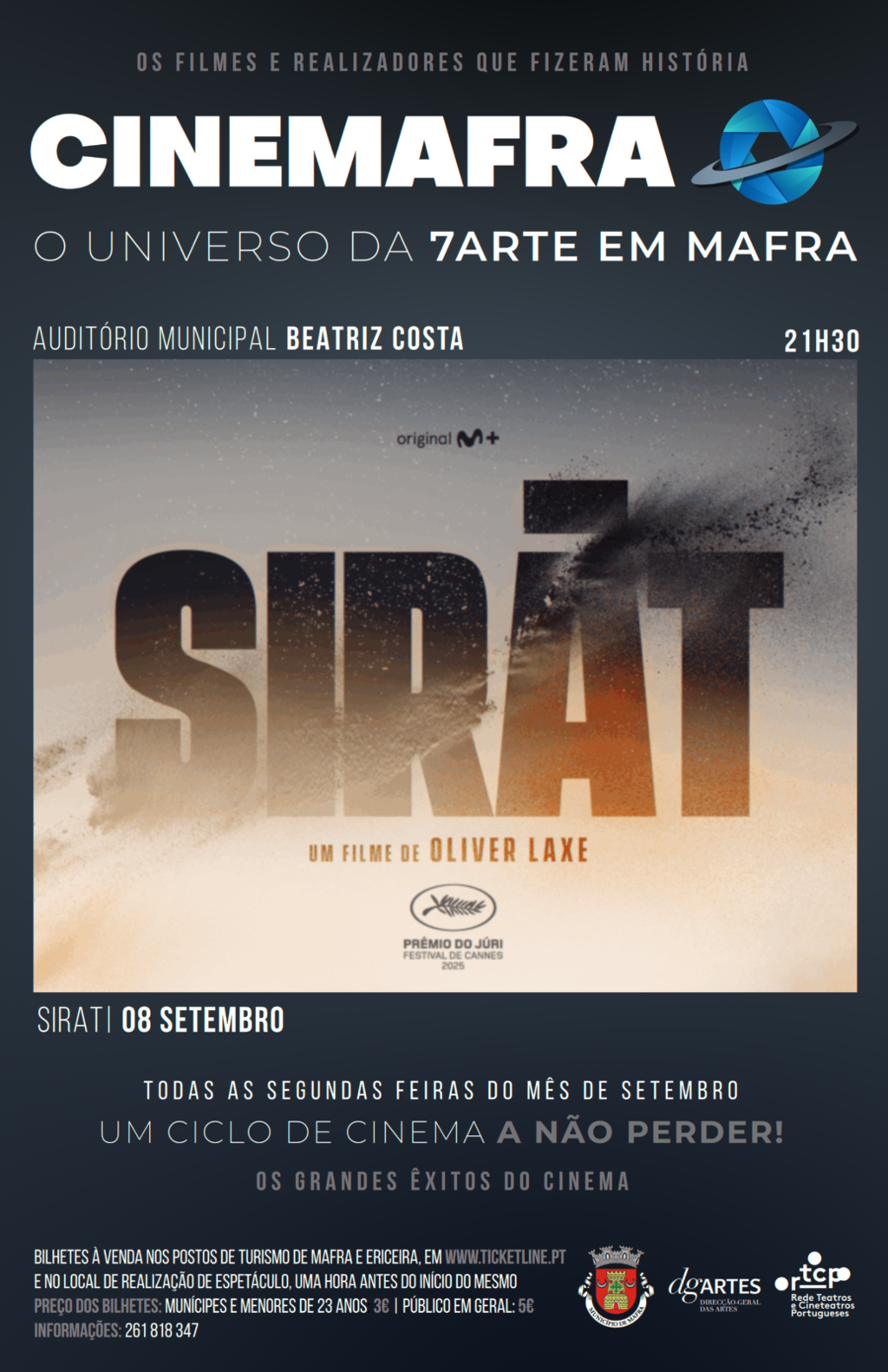 Bilhetes à venda nos Postos de Turismo de Mafra e Ericeira, na Casa de Cultura Jaime Lobo e Silva (Ericeira), em www.ticketline.pt/evento/cinemafra-sirat-96504 ou no local de exibição do filme, uma hora antes do início do mesmo.