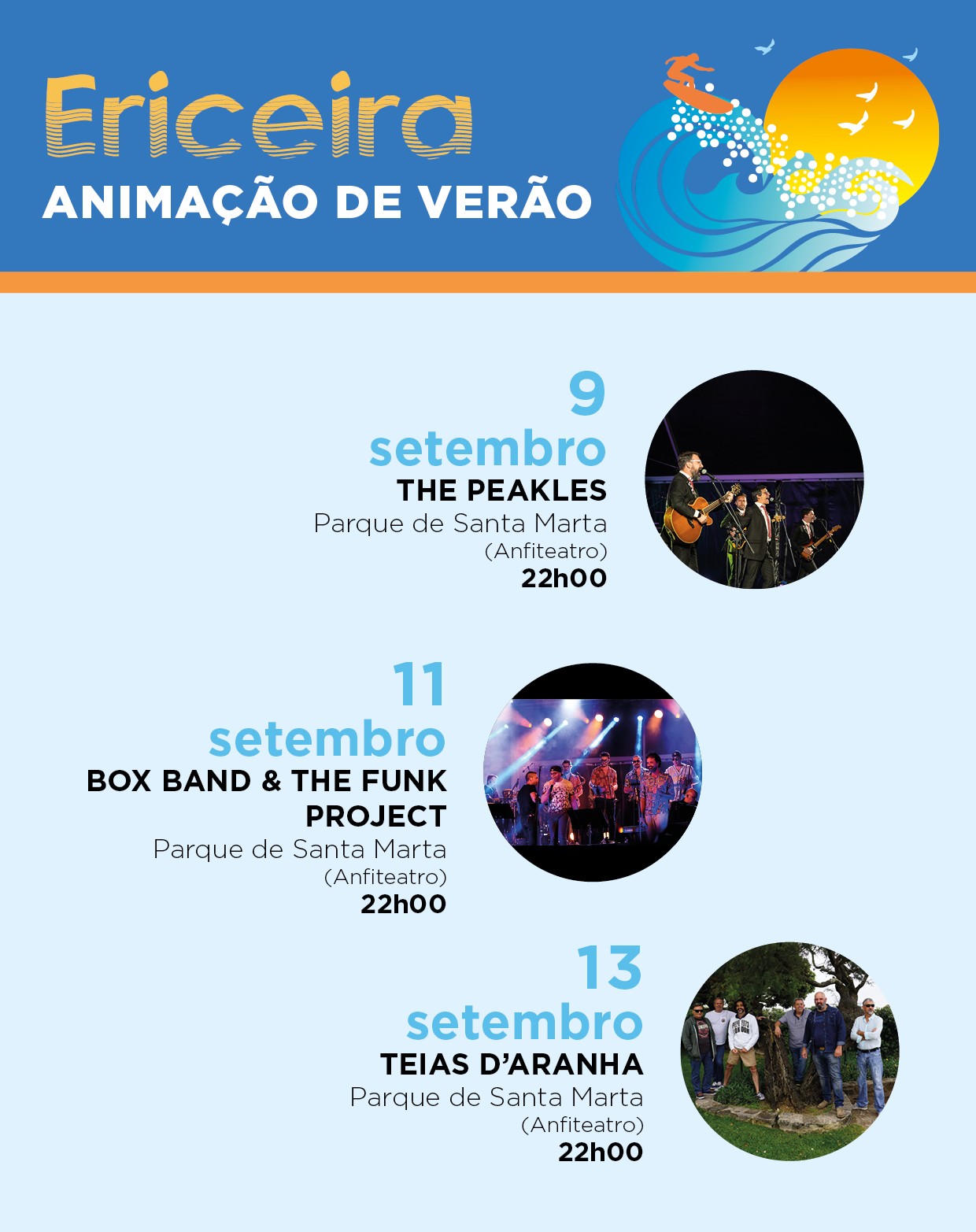 Está a chegar ao fim o programa tem vindo a animar as noites da vila da Ericeira. Tributos, pop e rock são os estilos que vão marcar a última semana desta iniciativa. Não perca os concertos, sempre às 22h00, no Parque de Santa Marta: