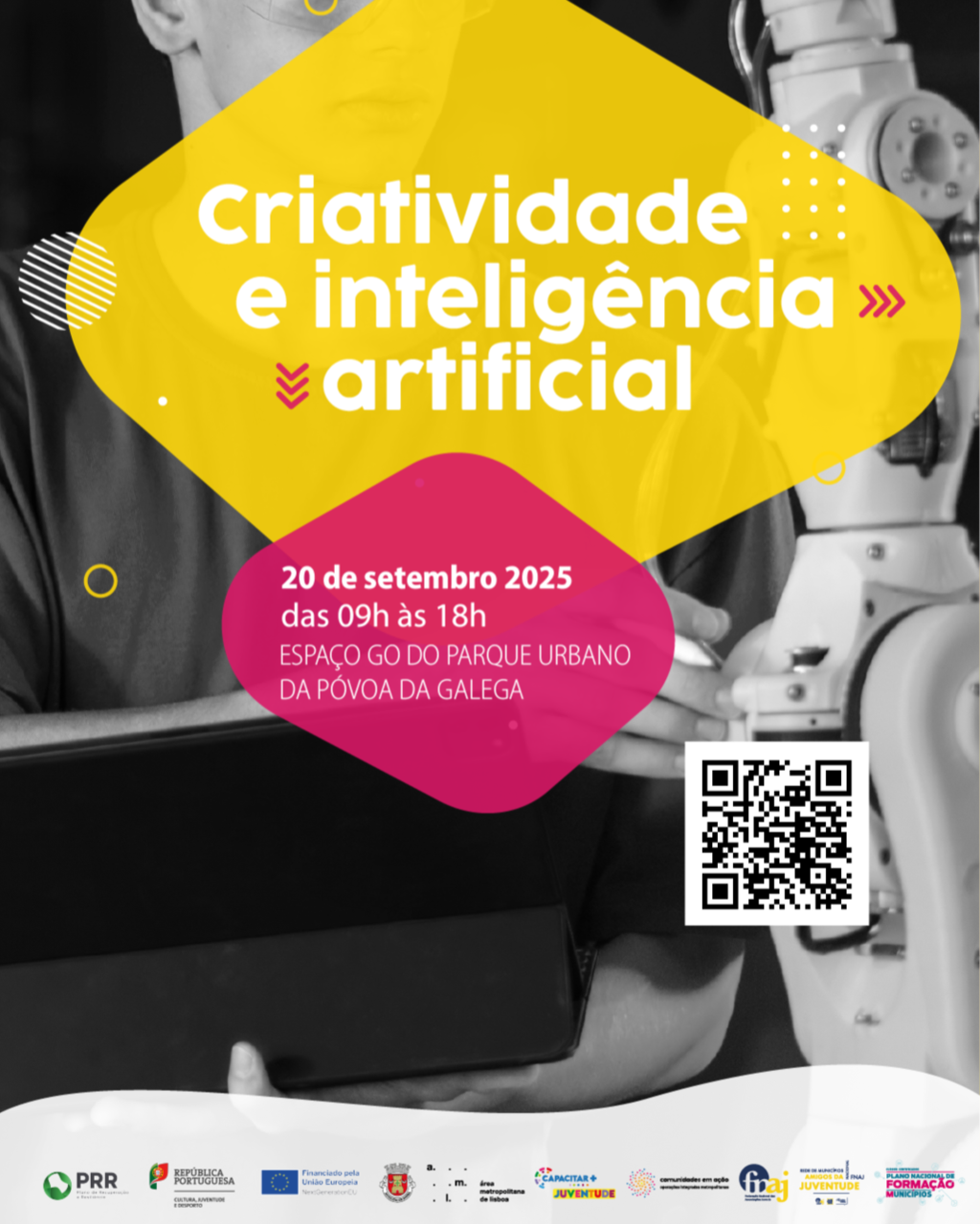 Serão os processos criativos influenciados pela Inteligência Artificial (IA)? Que conteúdos podem ser melhorados pelo recurso a IA? Se tens entre 14 e 29 anos, participa na ação de formação gratuita e certificada “Criatividade e Inteligência Artificial”, no dia 20 de setembro (sábado), entre as 09h00 e as 18h00, no GO #OTEUESPAÇO do Parque Urbano da Póvoa da Galega.