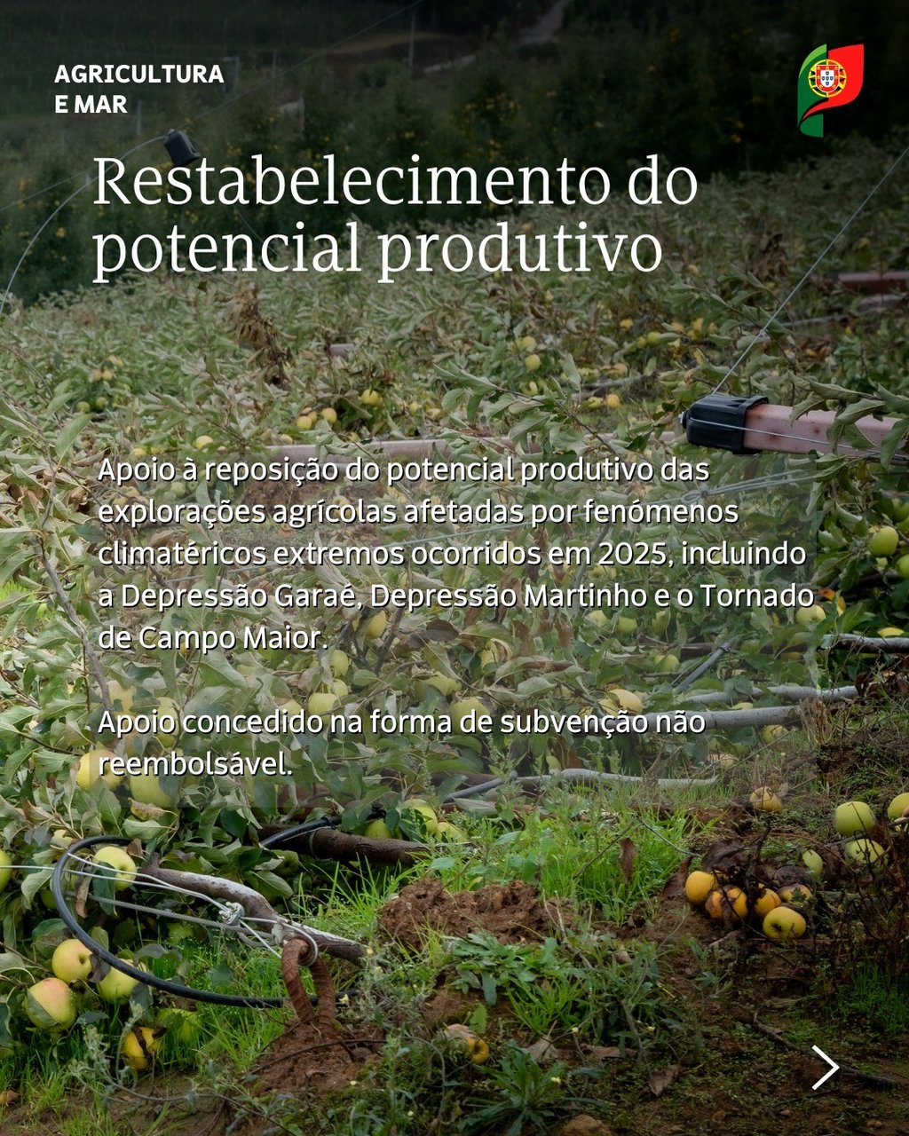 Até ao dia 30 de setembro de 2025, estão abertas as candidaturas para atribuição do apoio financeiro “Restabelecimento do Potencial Produtivo”, previsto no Plano Estratégico da Política Agrícola Comum para Portugal (PEPAC Portugal), destinado a agricultores cuja atividade foi afetada pela depressão Martinho, em março do corrente ano.