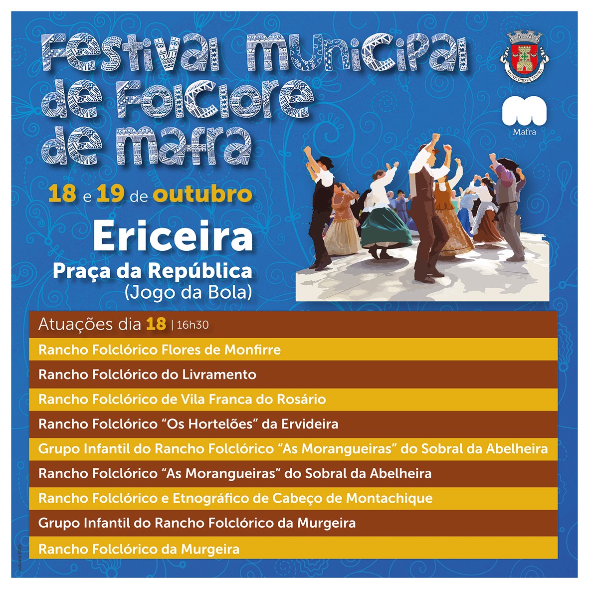 O evento que celebra as tradições locais volta a reunir os Ranchos Folclóricos e Grupos de Danças e Cantares do Concelho de Mafra. A 8.ª edição do Festival Municipal de Folclore realiza-se nos dias 18 e 19 de outubro, na Praça da República (Jogo da Bola), na Ericeira.