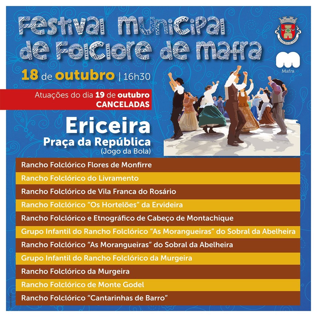 Devido à previsão de condições meteorológicas adversas para o próximo domingo (19 de outubro), foram canceladas as atuações previstas no âmbito do Festival Municipal de Folclore. Assim, mantendo-se a realização do festival no sábado (18 de outubro), o programa foi revisto, passando a contar com atuações dos seguintes Ranchos e Grupos Folclóricos no palco instalado na Praça da República (Jogo da Bola), na Ericeira: