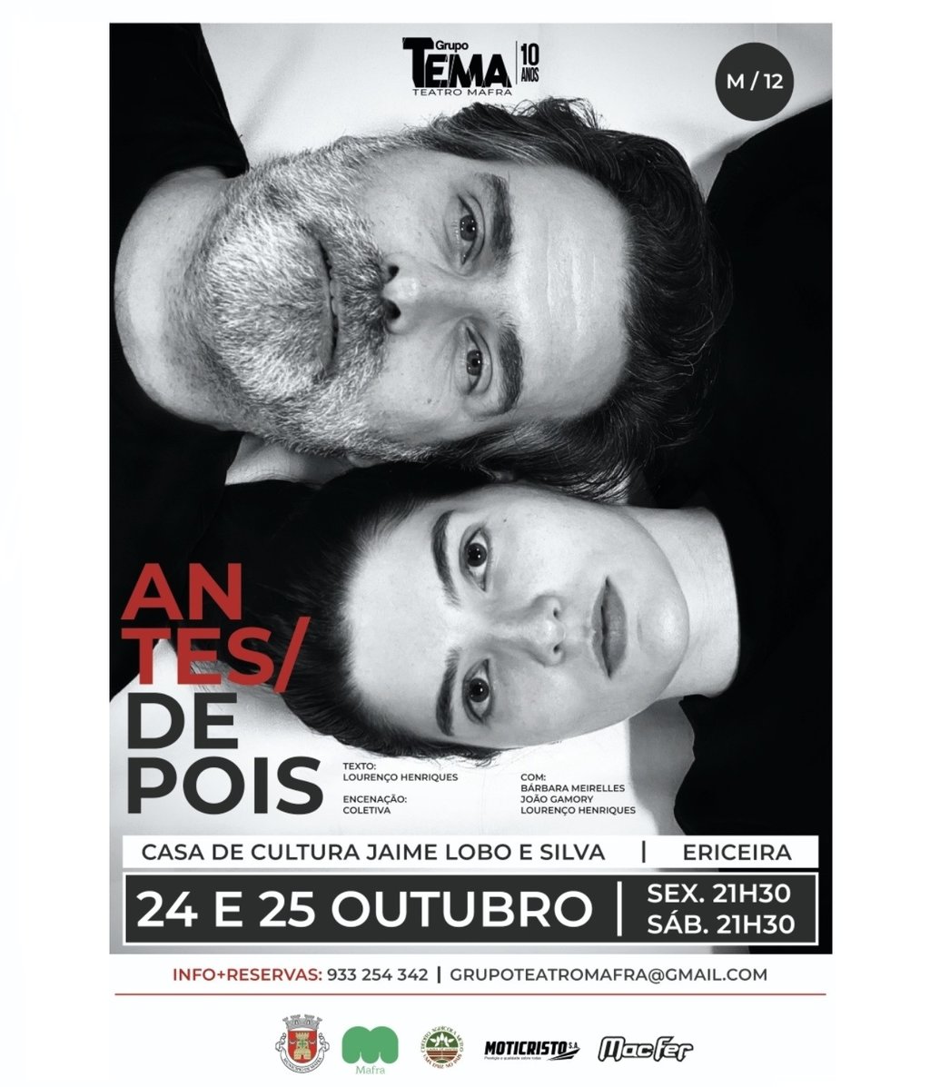 O que fica connosco, para sempre, depois de acabar o amor? “Antes/Depois” é o espetáculo que o Grupo TEMA – Teatro Mafra volta a levar a cena, dez anos depois da sua estreia, para voltar a avaliar o amor, o labirinto das relações o seu início e o seu fim. A estreia está marcada para os dias 24 e 25 de outubro, às 21h30, na Casa de Cultura Jaime Lobo e Silva, na Ericeira.